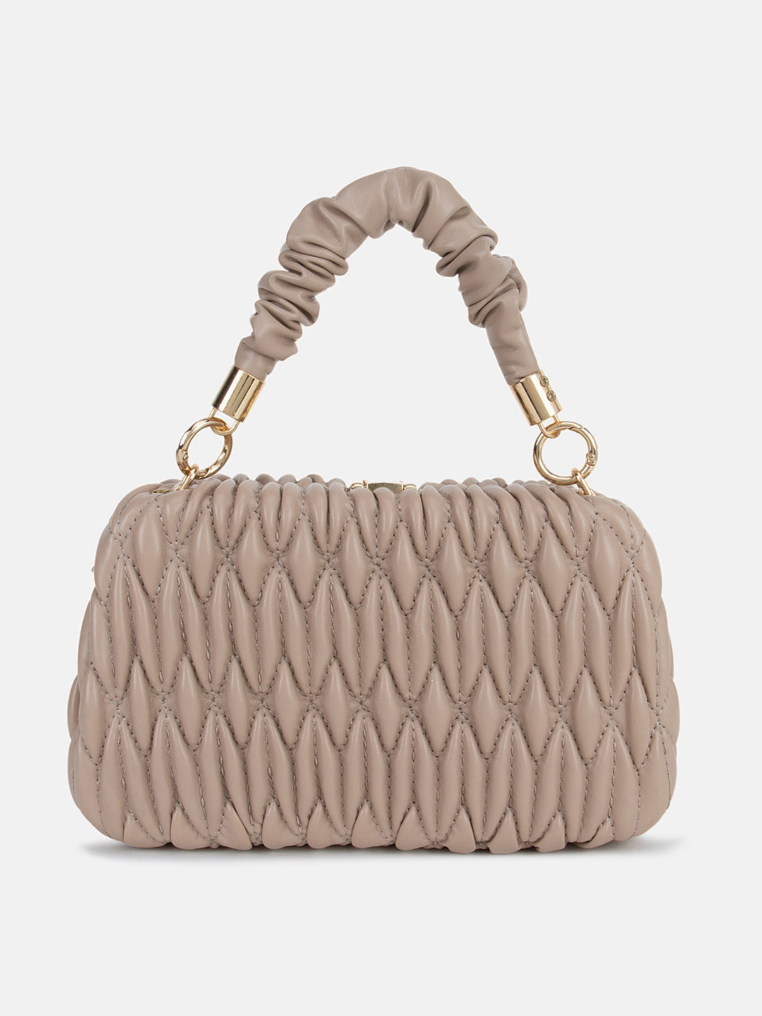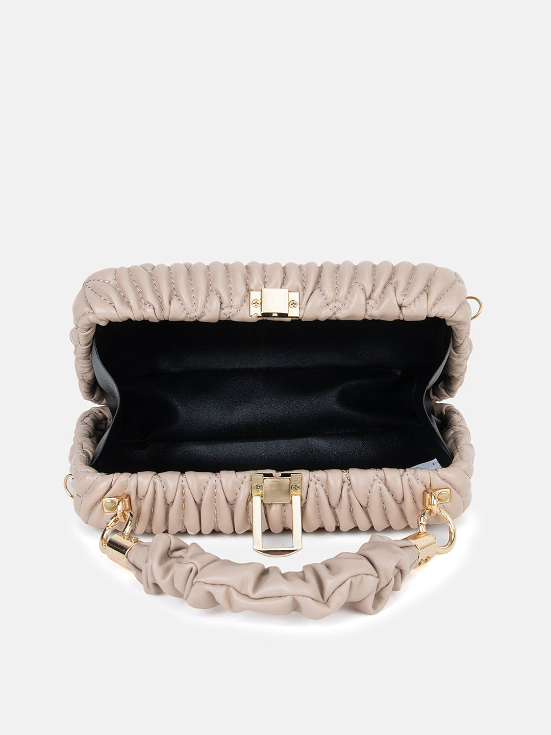 Sling bag with an unique designed quilting. Pleating handheld detail on the handle. Inside pocket. crossbody strap. Lock clasp closure.
