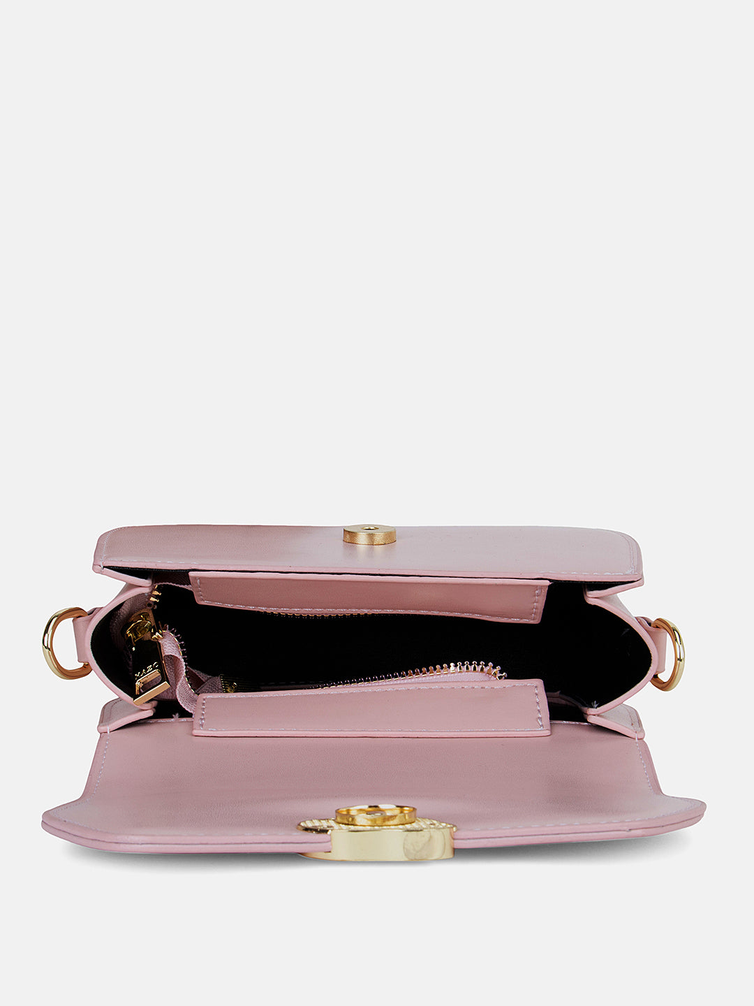 City bag with abstract flap & buckle. Metal buckle detail on the front. Inside pocket with crossbody strap. Flap with magnetic clasp closure.