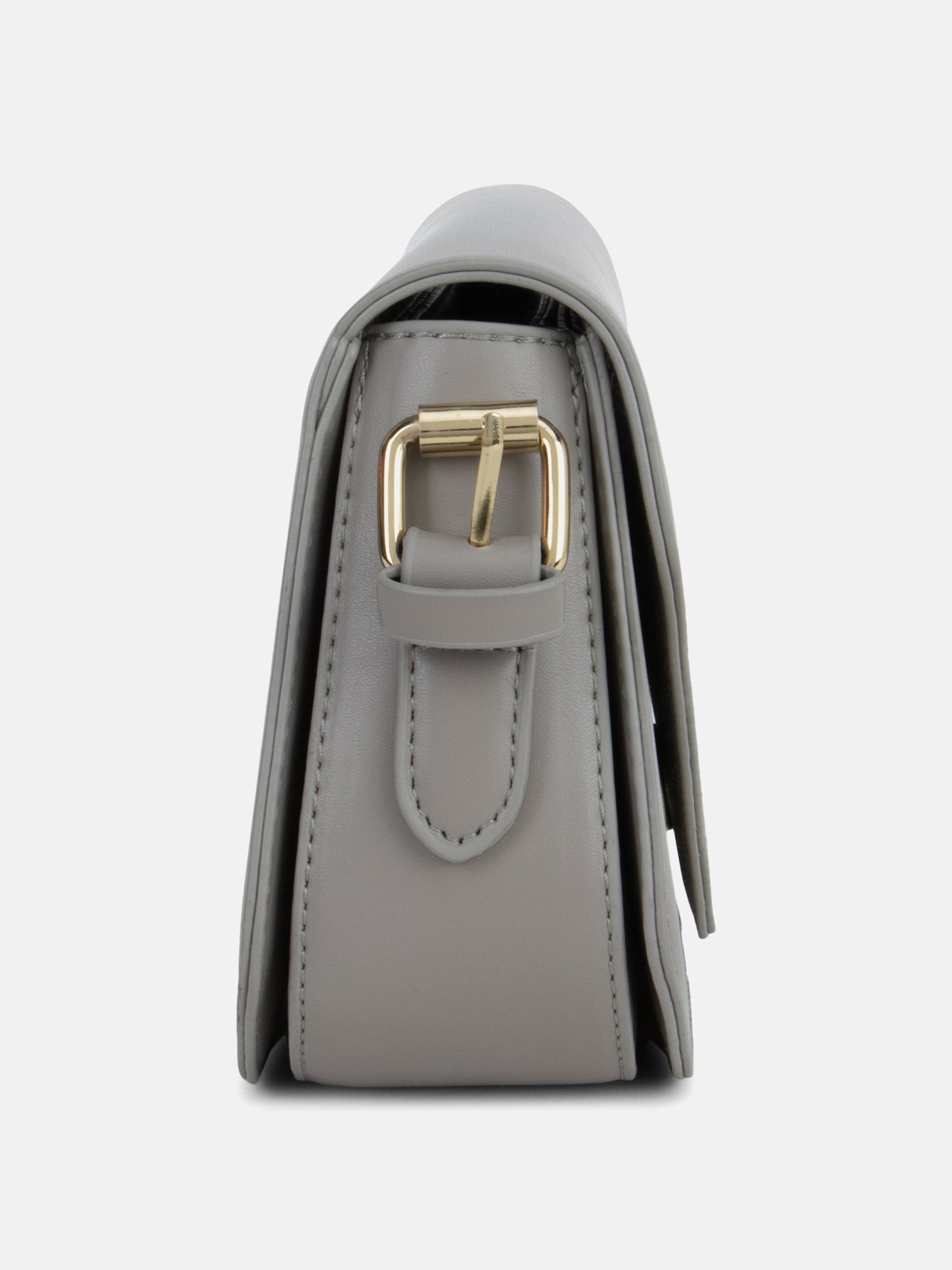 Hand bag with faux leather exterior. Lined interior with pocket and divided into several compartments. Magnetic clasp closure with metal buckle.
