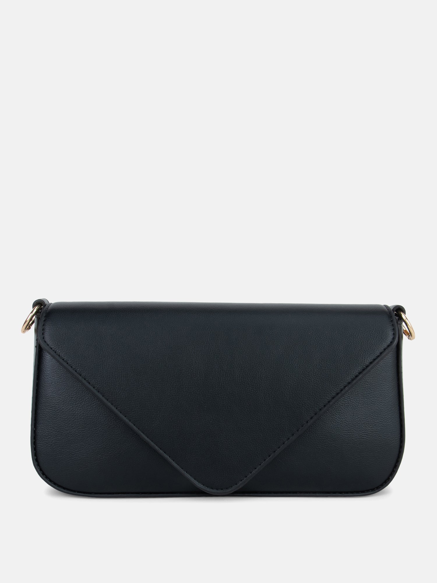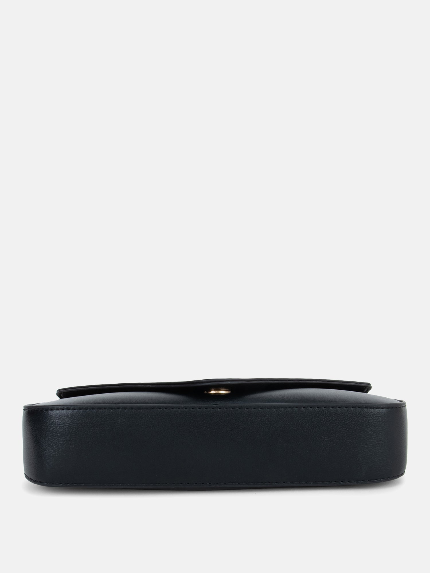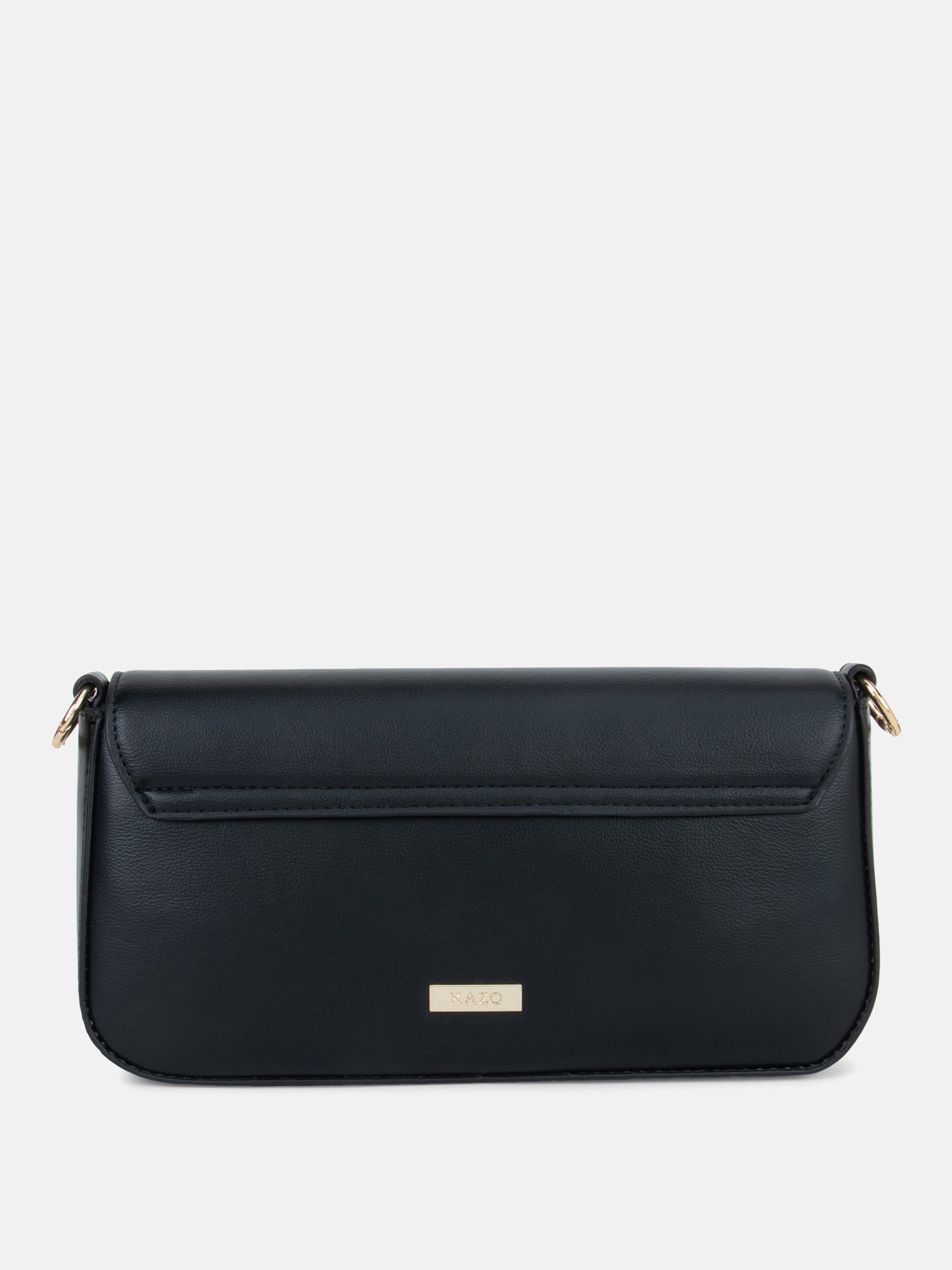 Hand bag with faux leather exterior. Lined interior with pocket and divided into several compartments. Magnetic clasp closure with metal buckle.