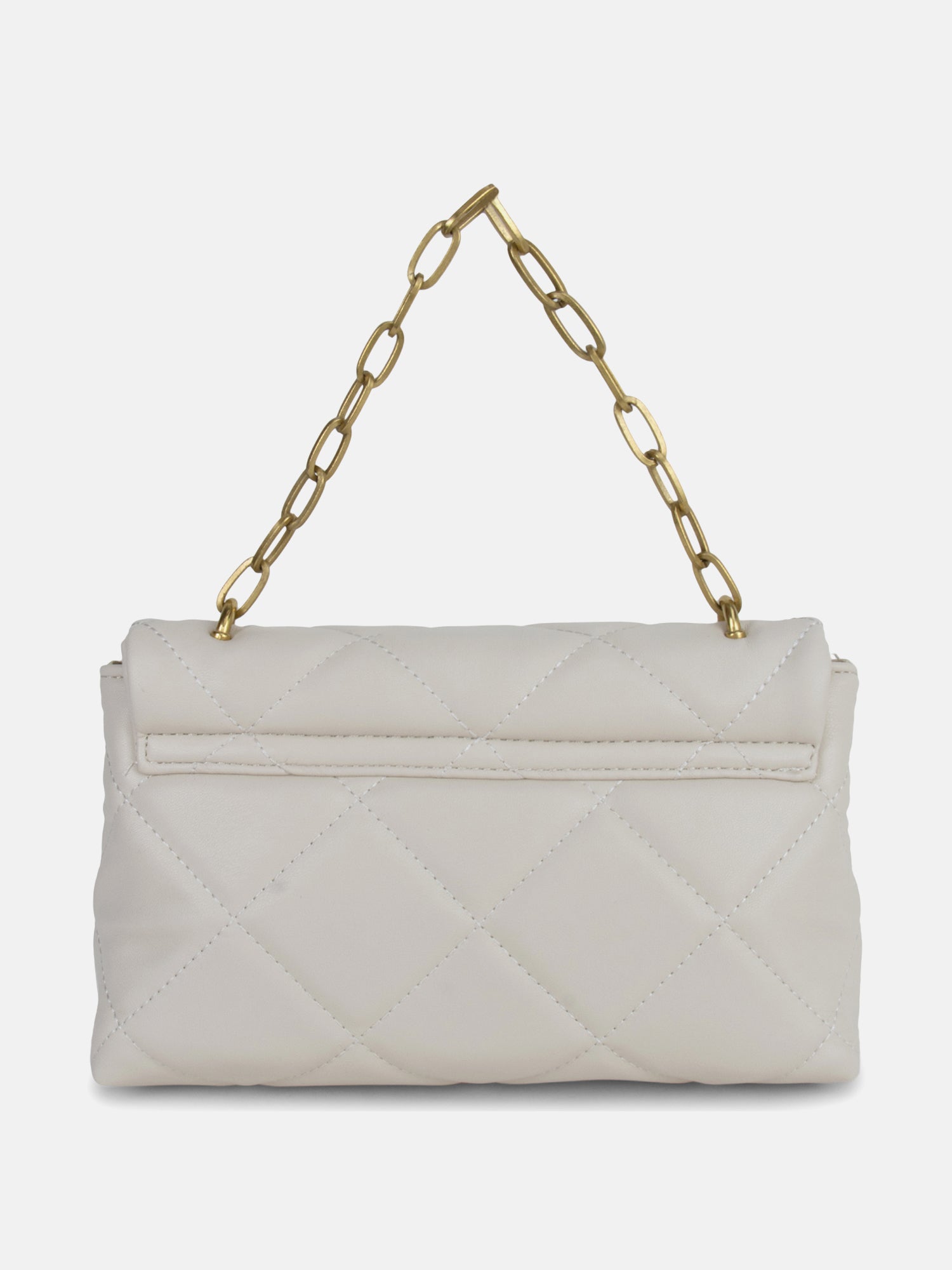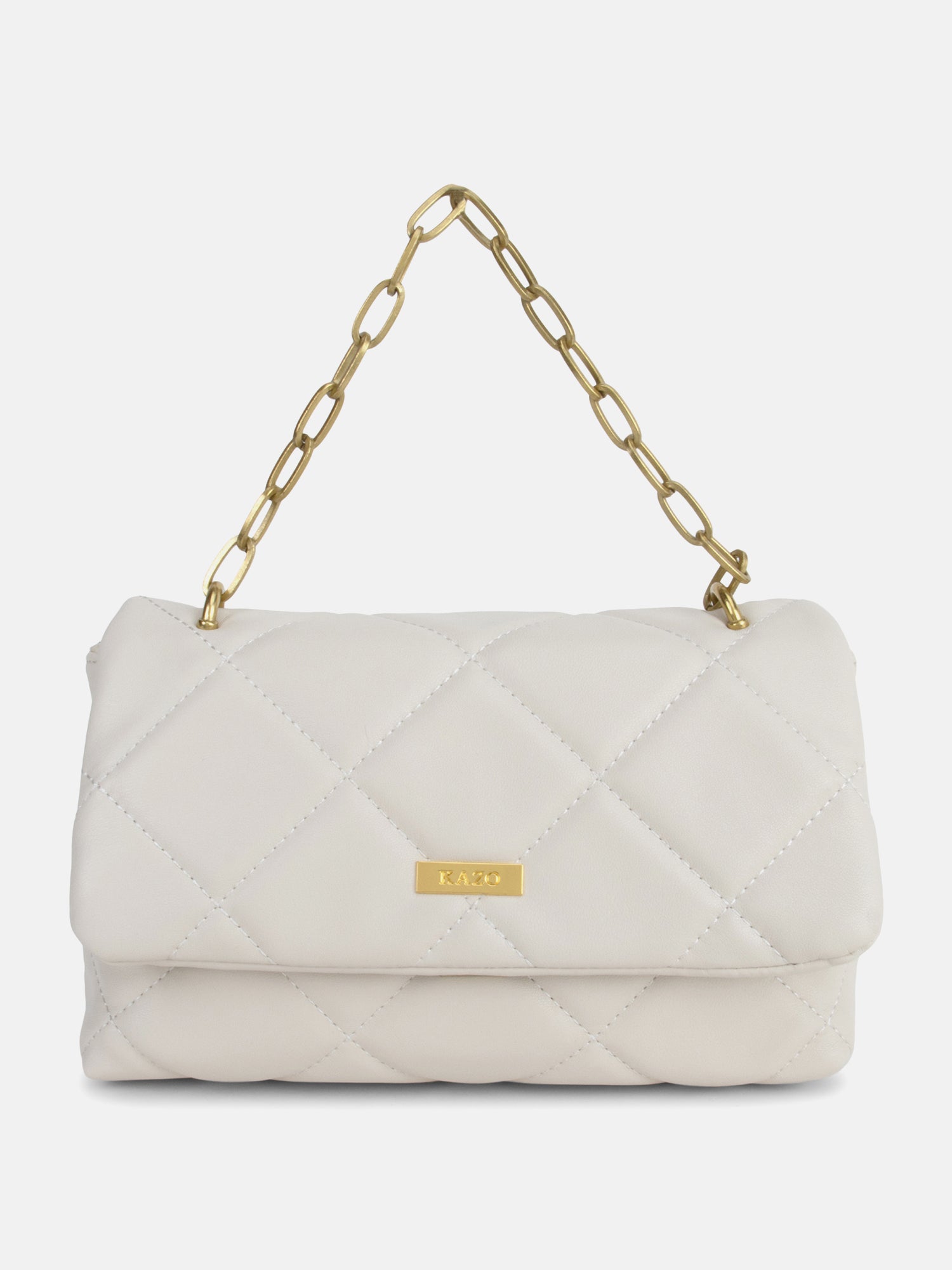 Soft Puffed faux leather in a quilted style gives this luxurious look. Brushed gold-tone hardware, weaved chain handle shoulder strap. Lined interior with pocket. Claps Magnetic closure.