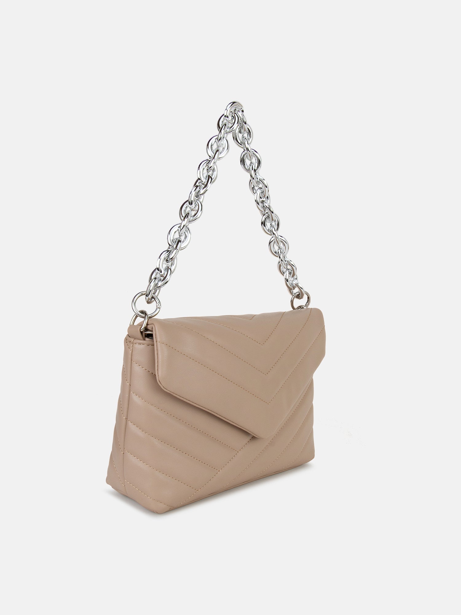 This unique quilting handbag has beauty with grace of bold Chain handle, lock closure. Lined interior with pocket.