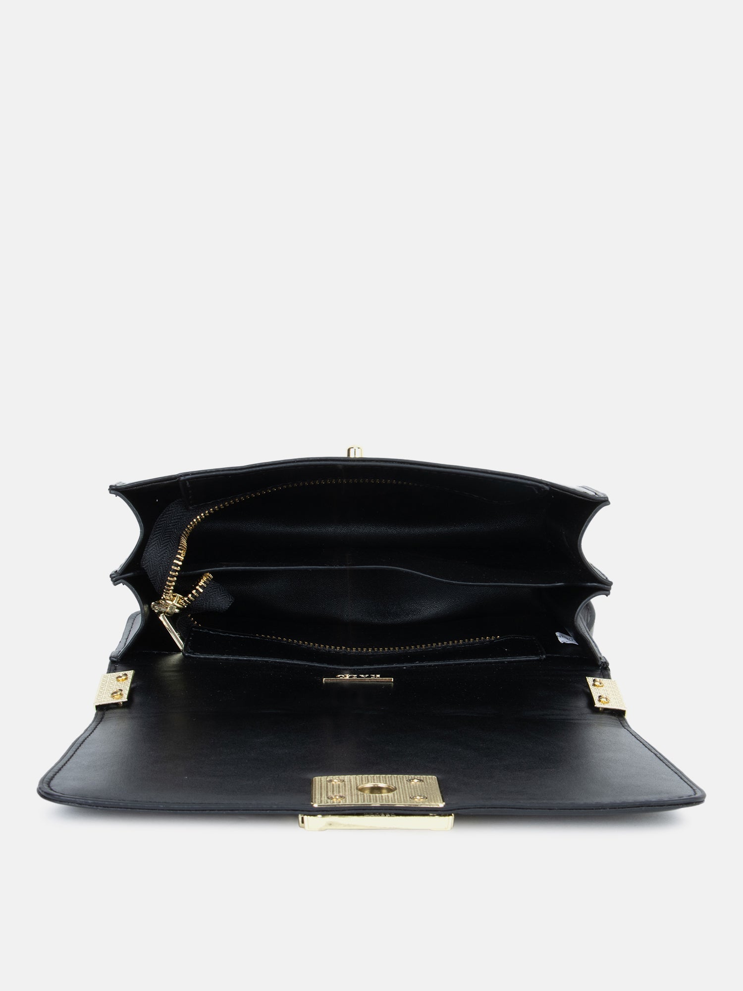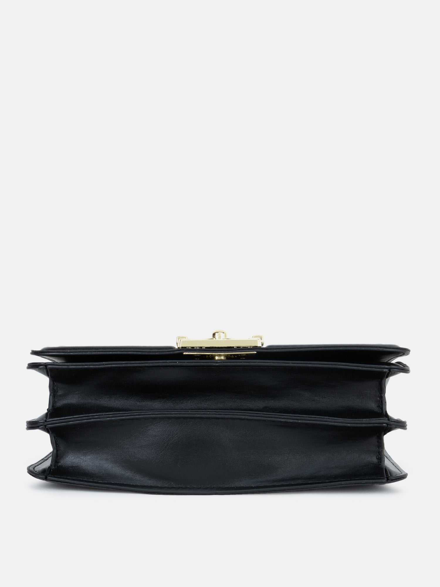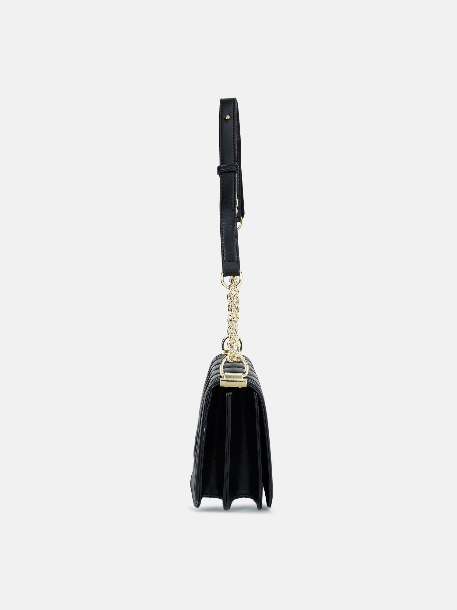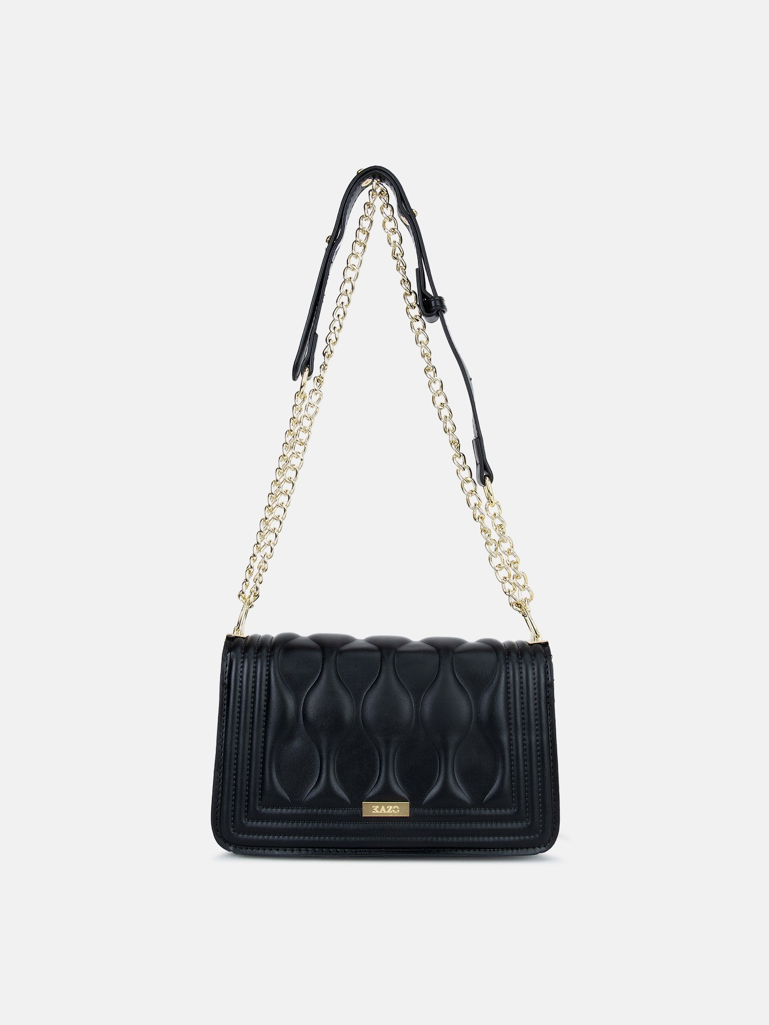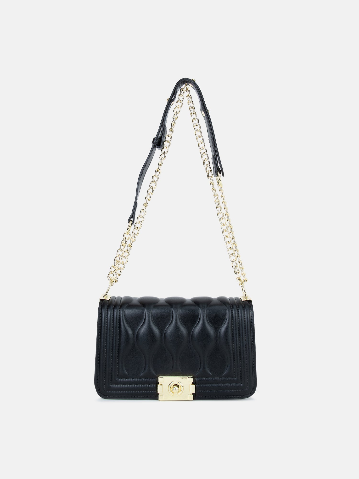 Shoulder bag with unique Quilted exterior. Thick chains shoulder strap. Lined interior with pocket. Big twisted lock closure.