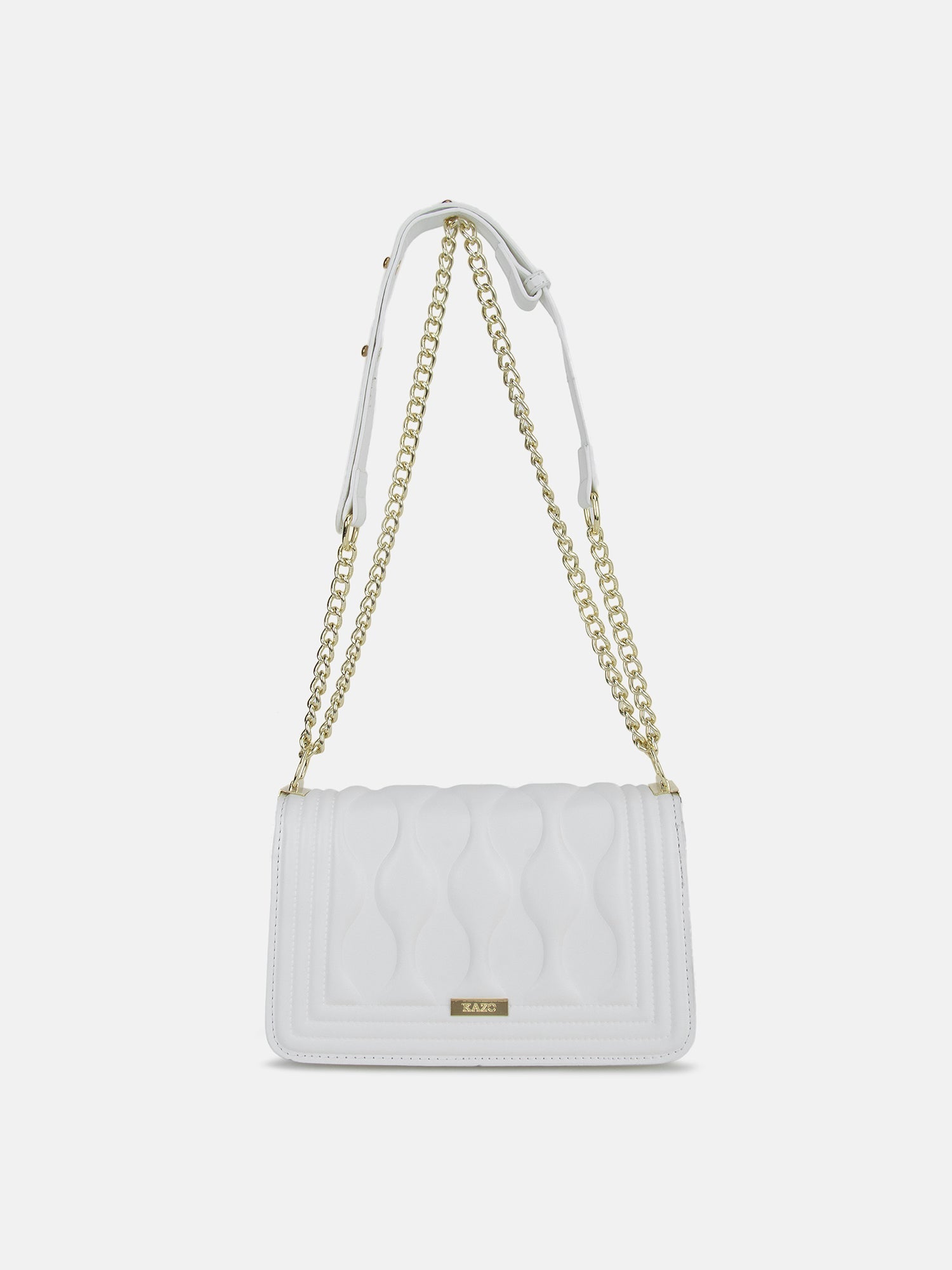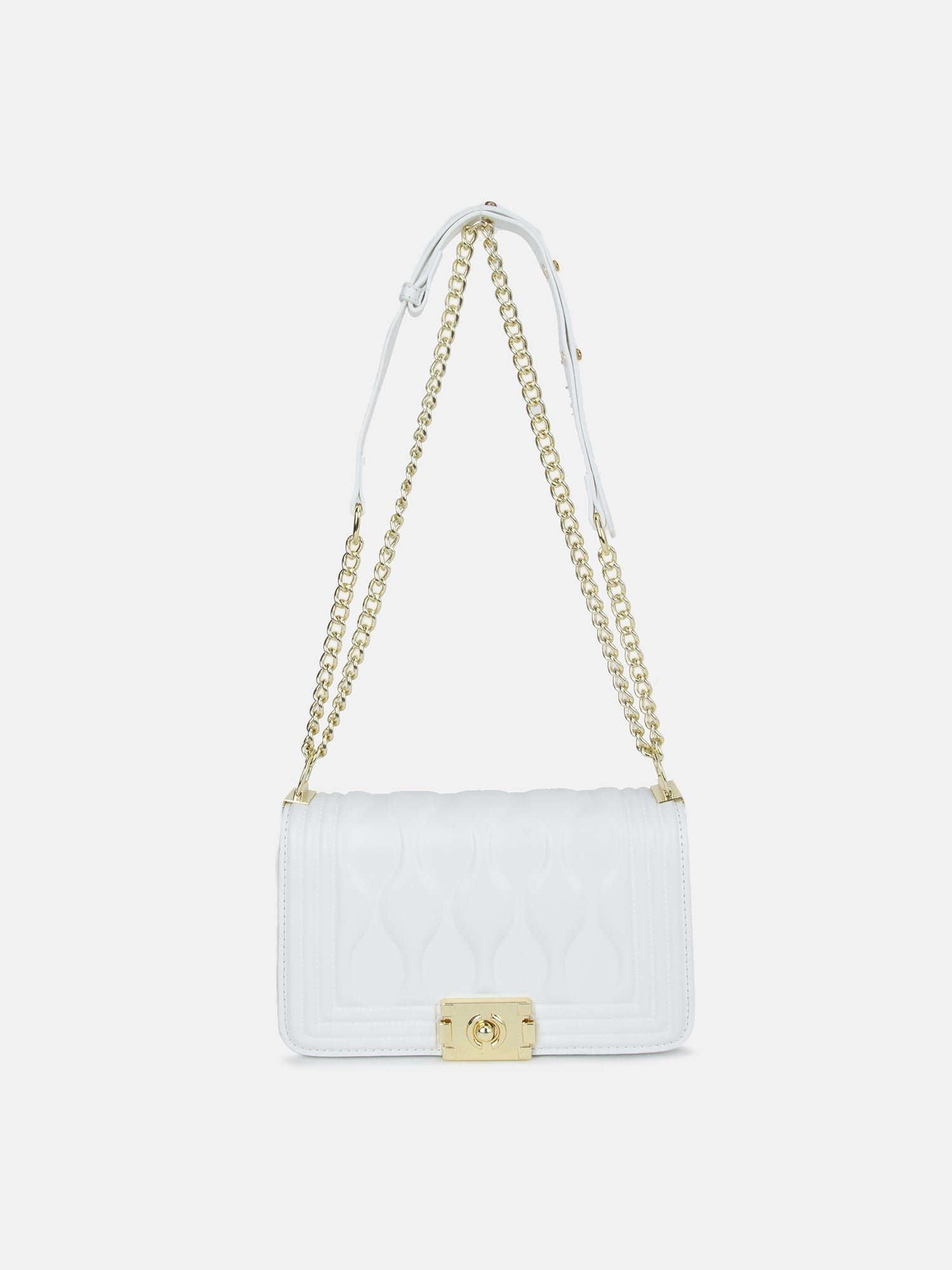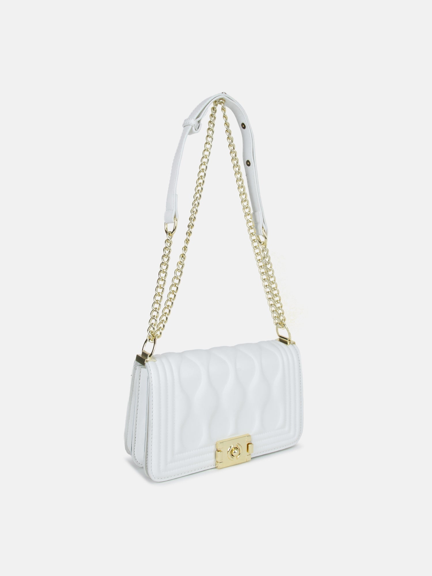 Shoulder bag with unique Quilted exterior. Thick chains shoulder strap. Lined interior with pocket. Big twisted lock closure.