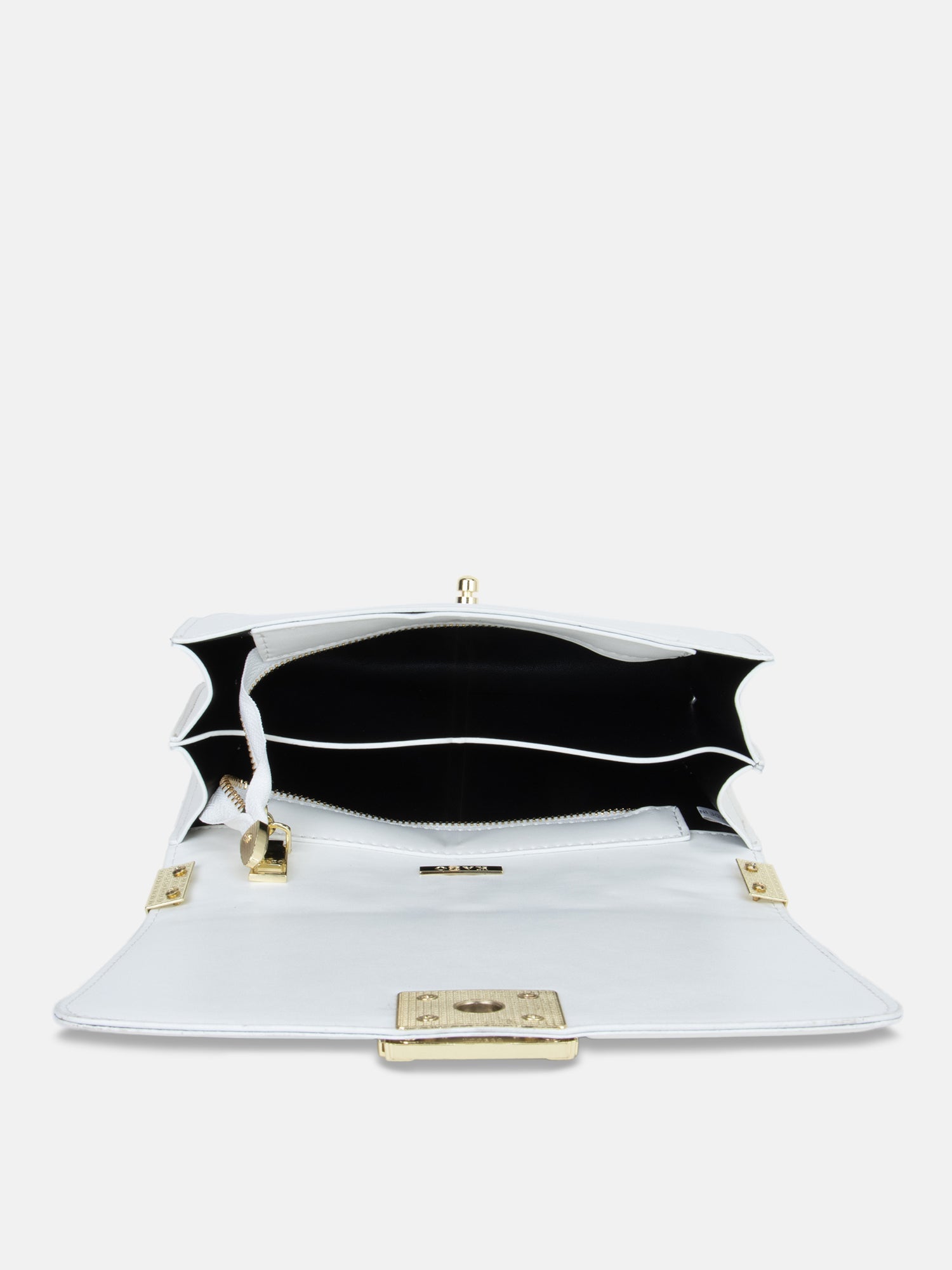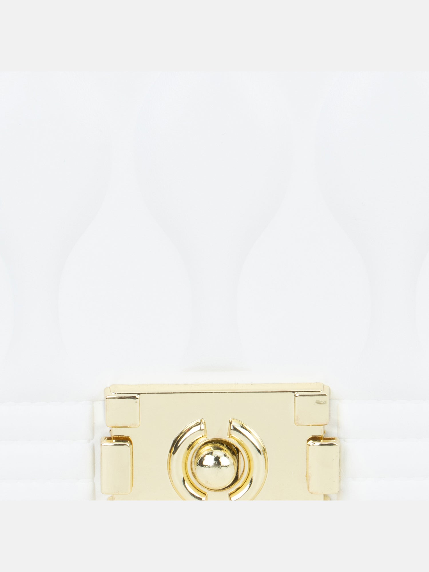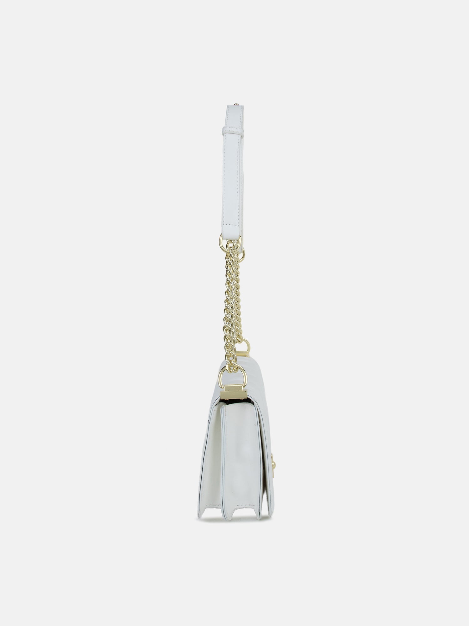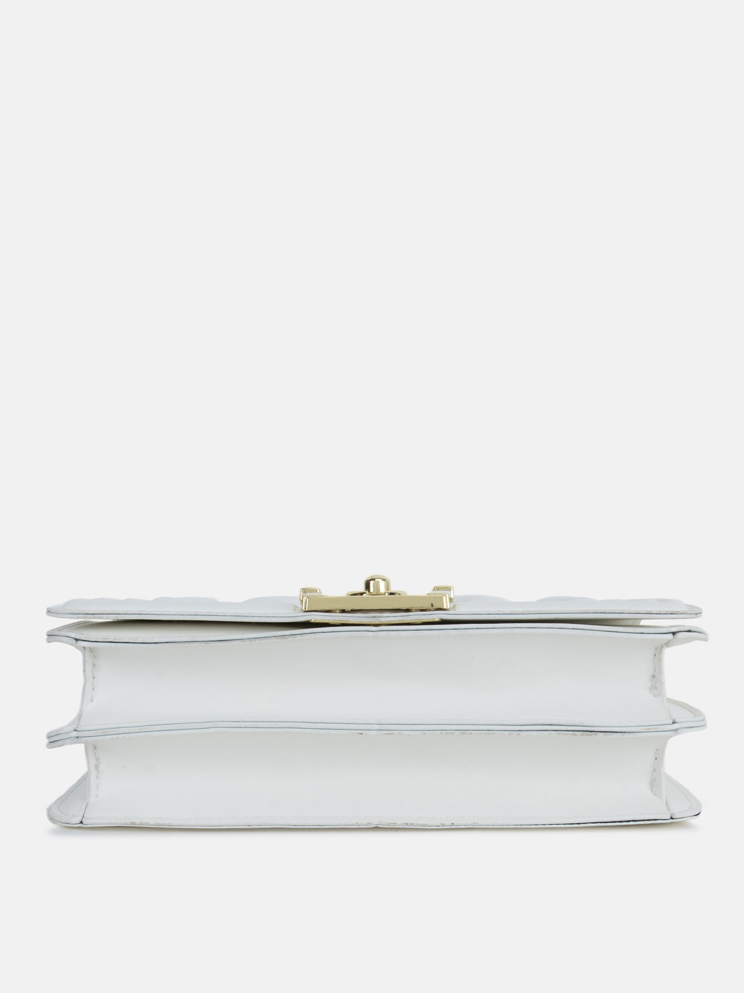 Shoulder bag with unique Quilted exterior. Thick chains shoulder strap. Lined interior with pocket. Big twisted lock closure.