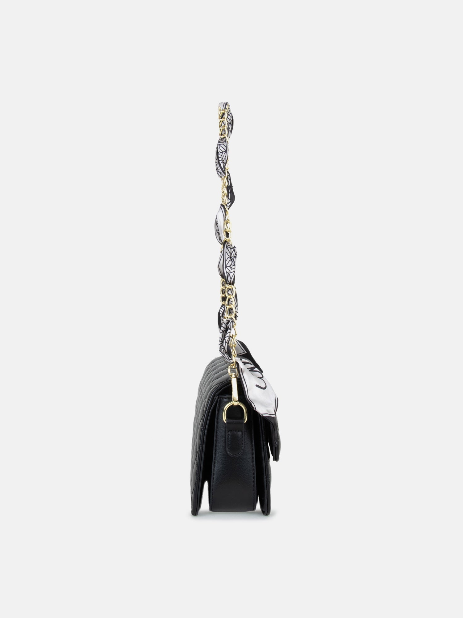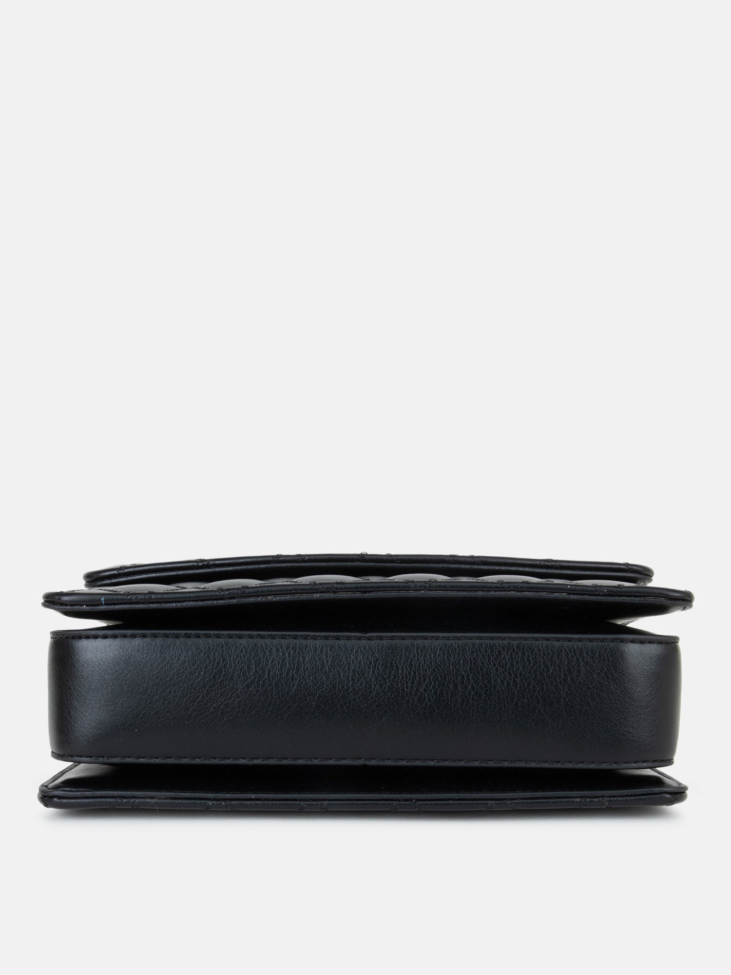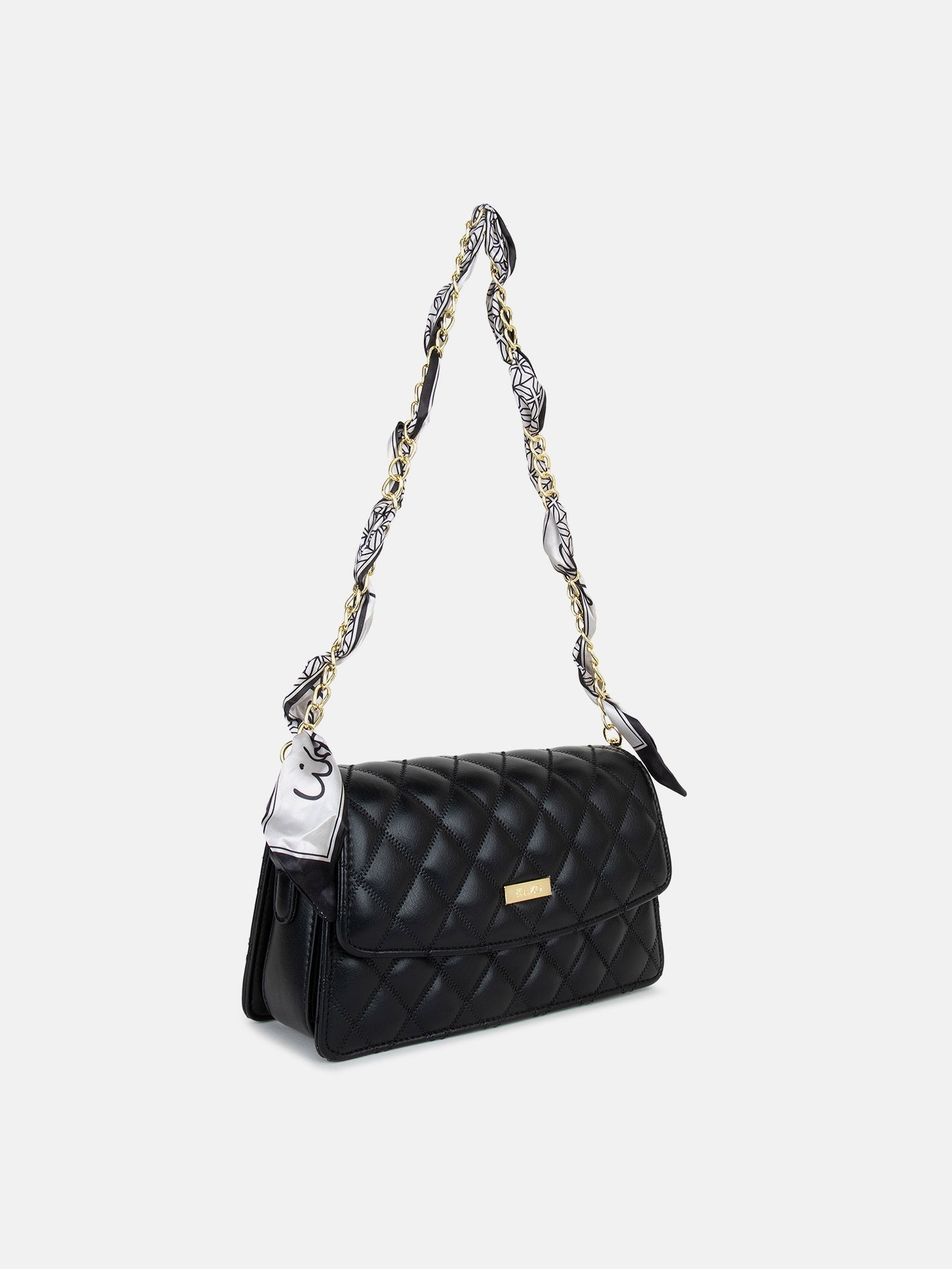 Crossbody bag with quilted all over faux leather exterior with chain shoulder details. Lined interior with pocket.