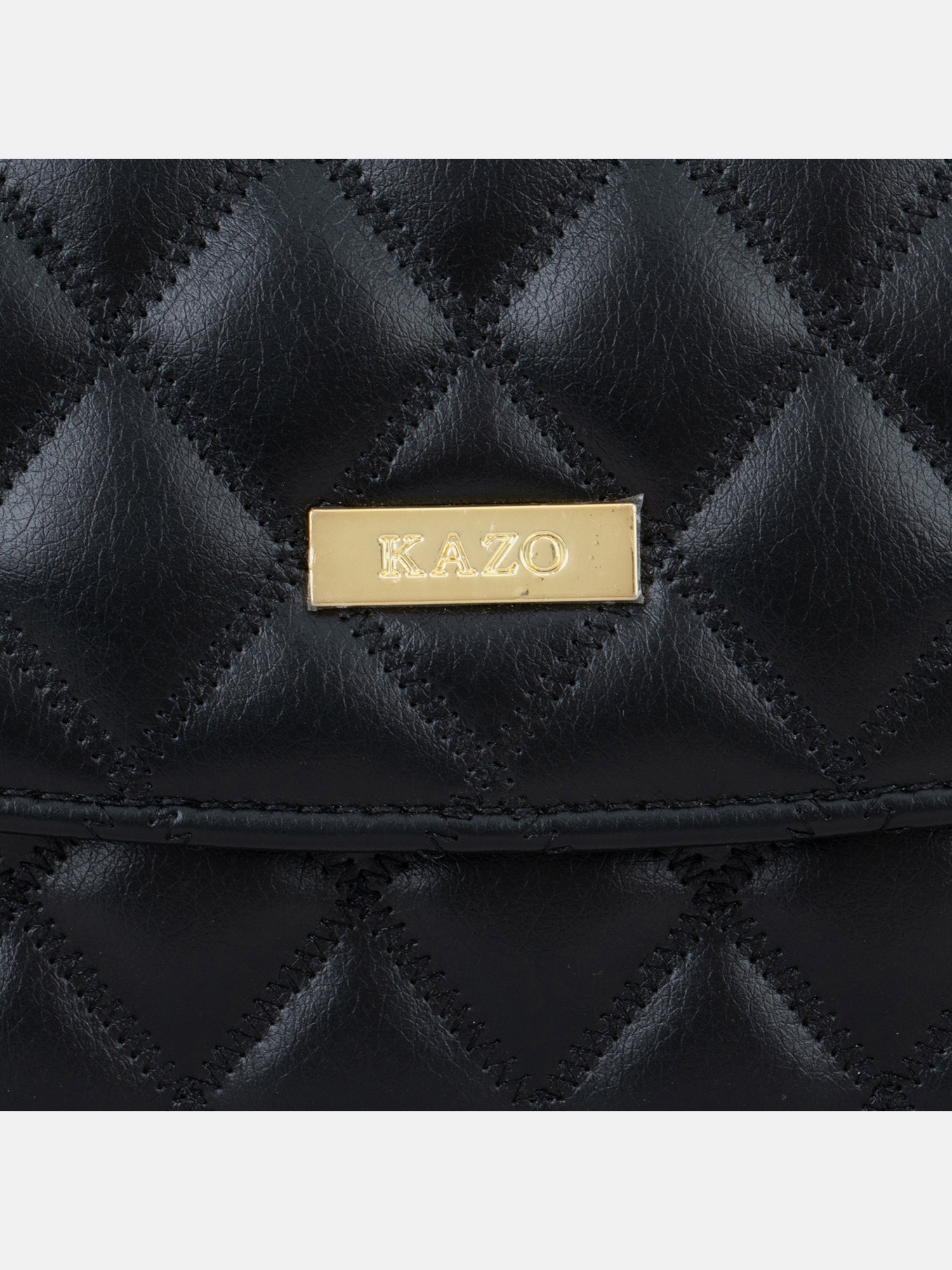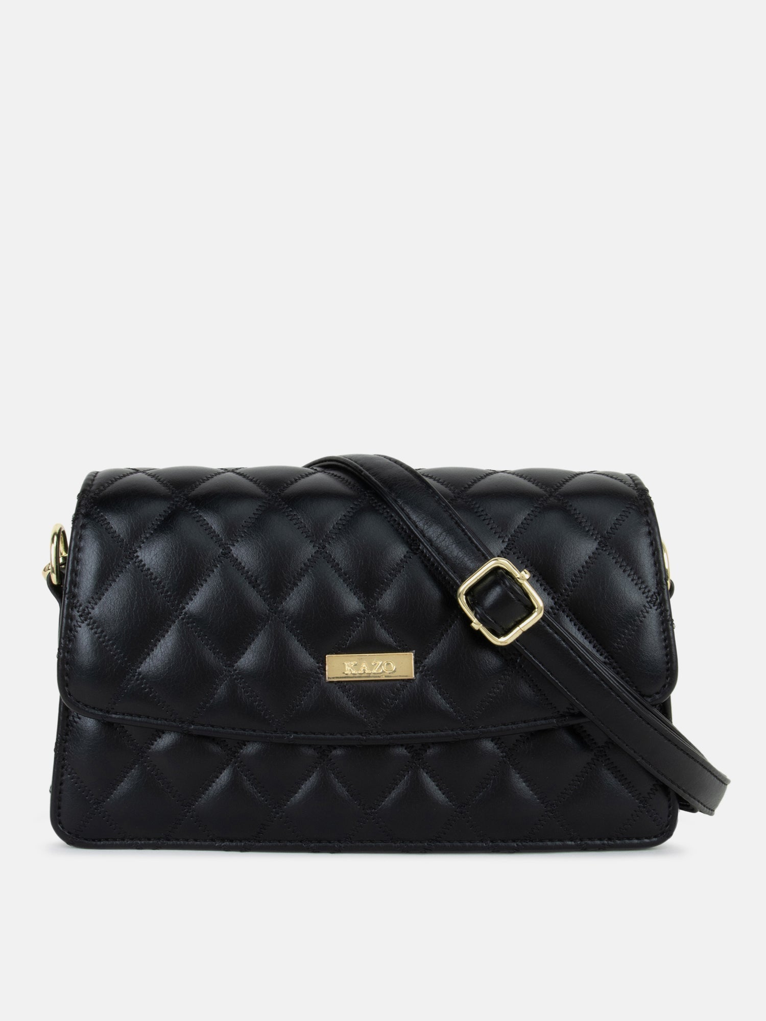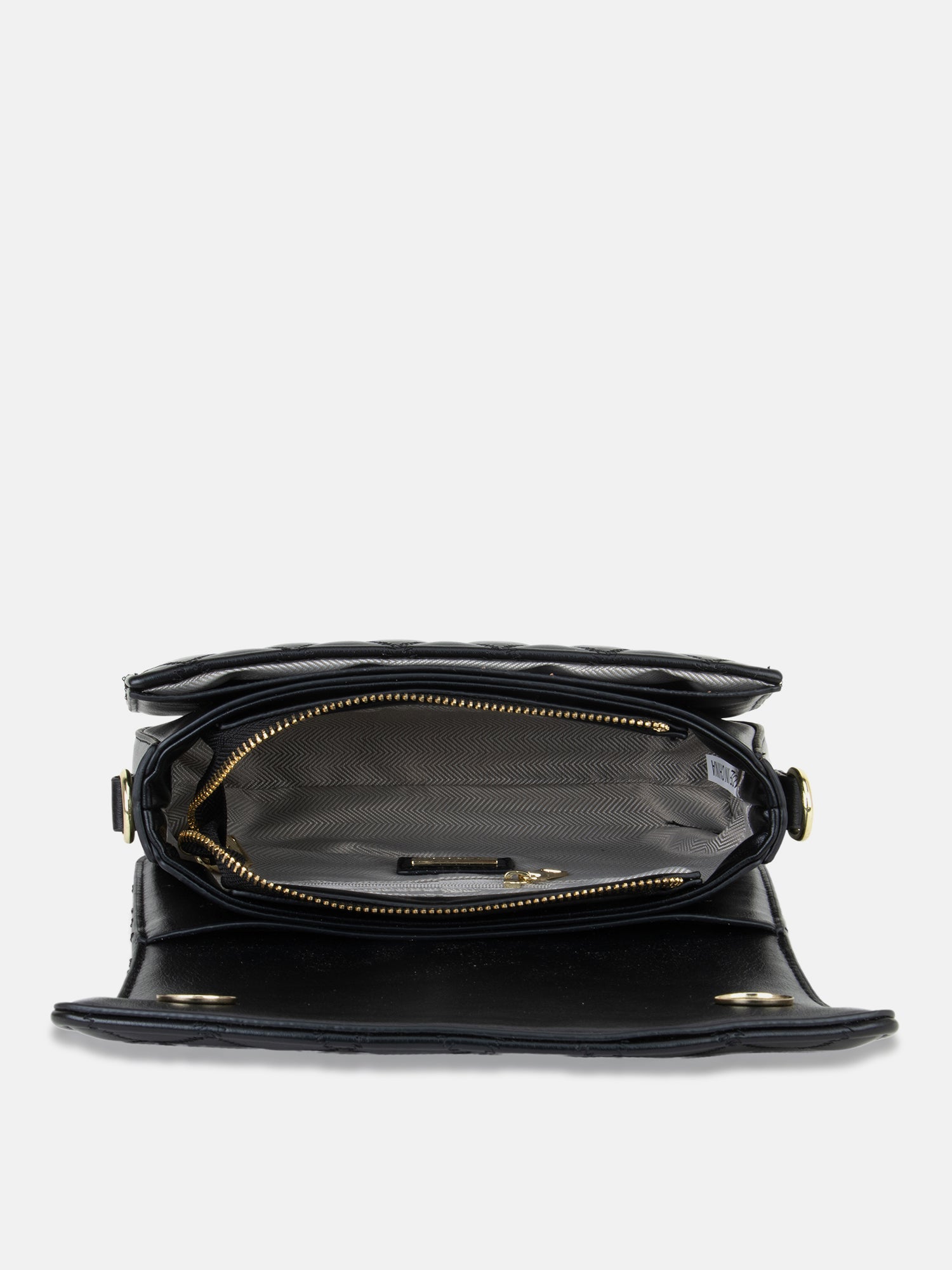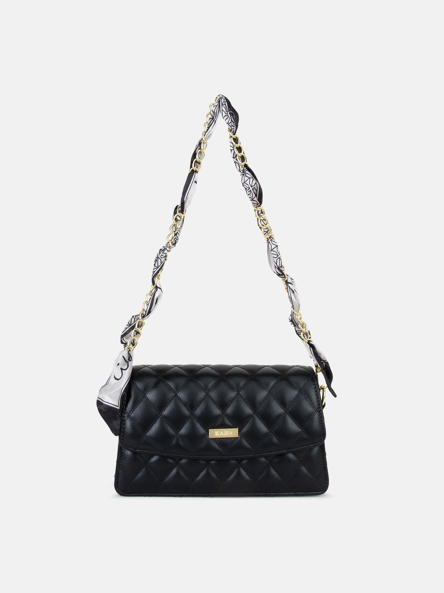 Crossbody bag with quilted all over faux leather exterior with chain shoulder details. Lined interior with pocket.