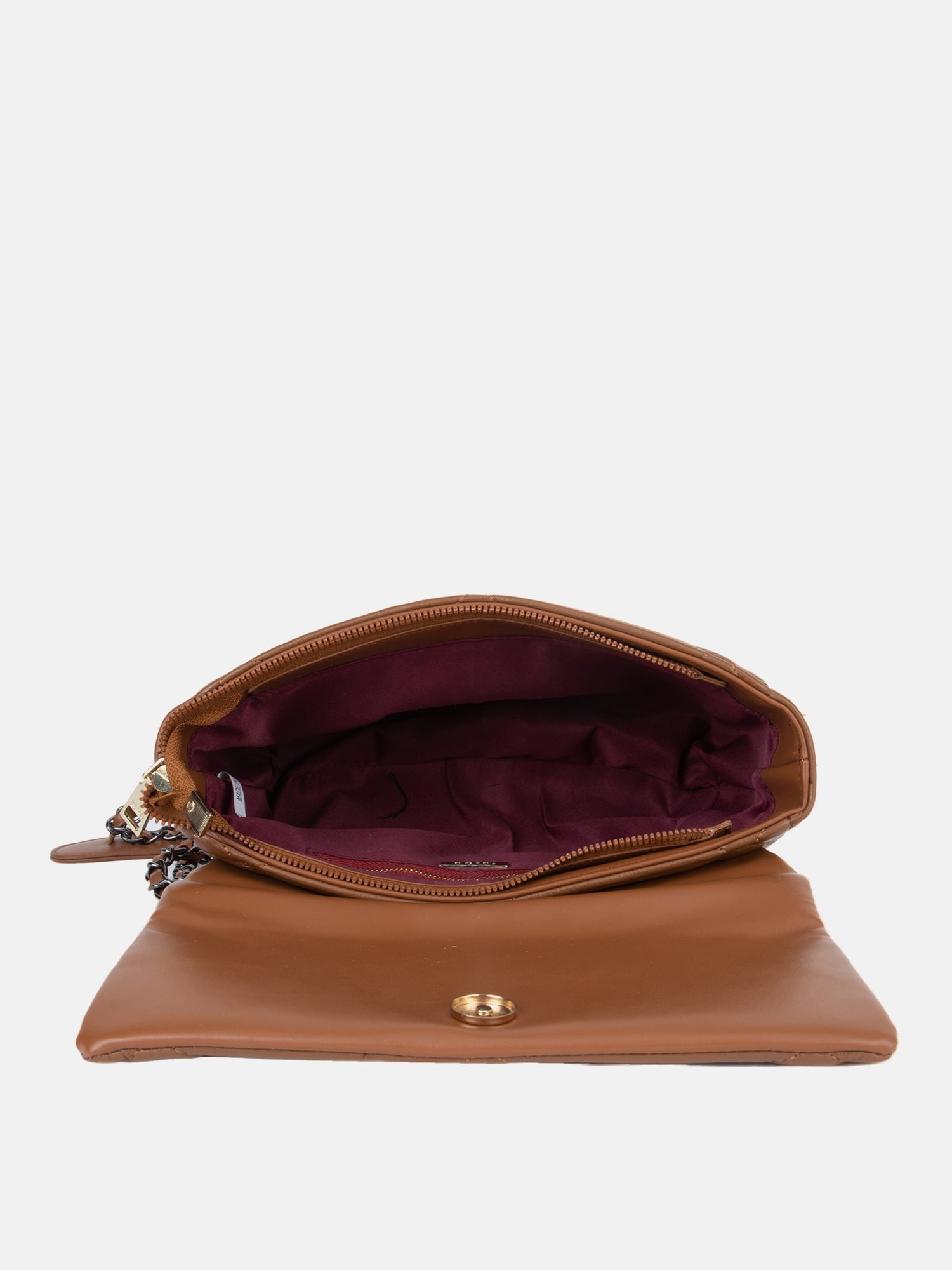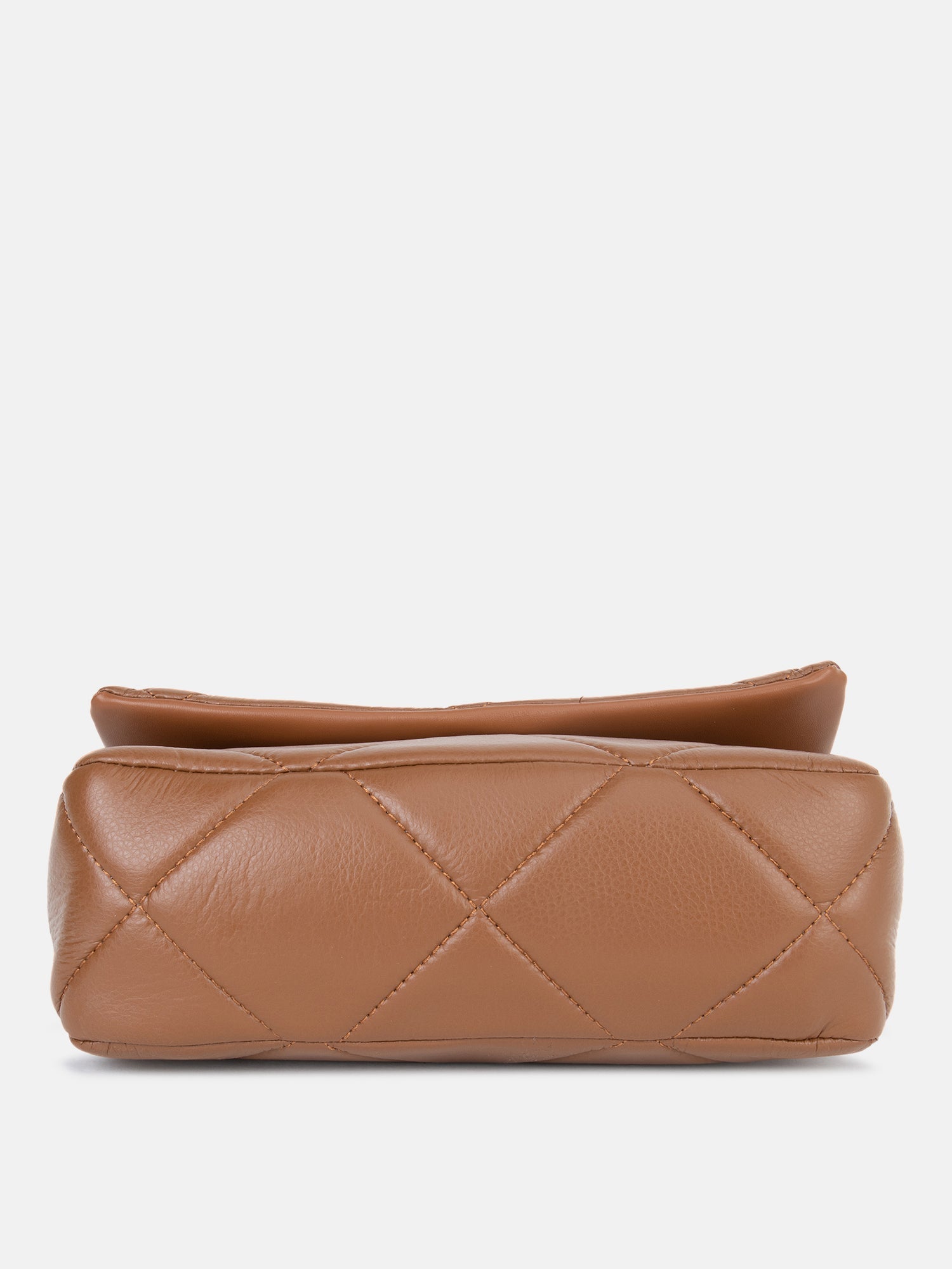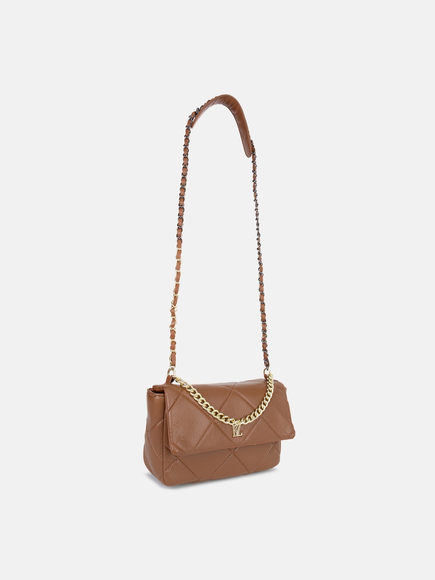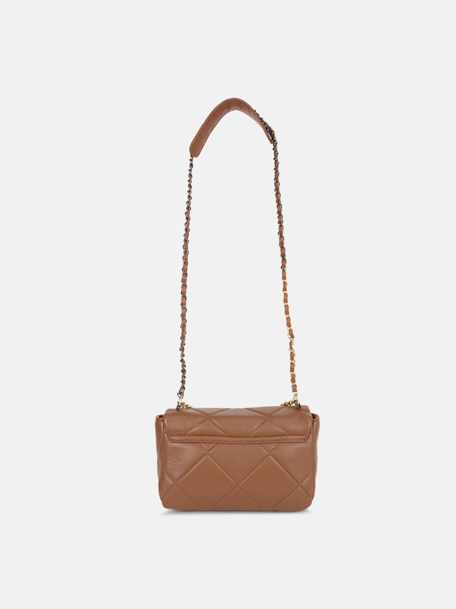Big quilting faux leather bag that gives a casual look. Brushed gold-tone hardware, weaved chain handle shoulder strap. Lined interior with pocket. Claps twist lock closure.