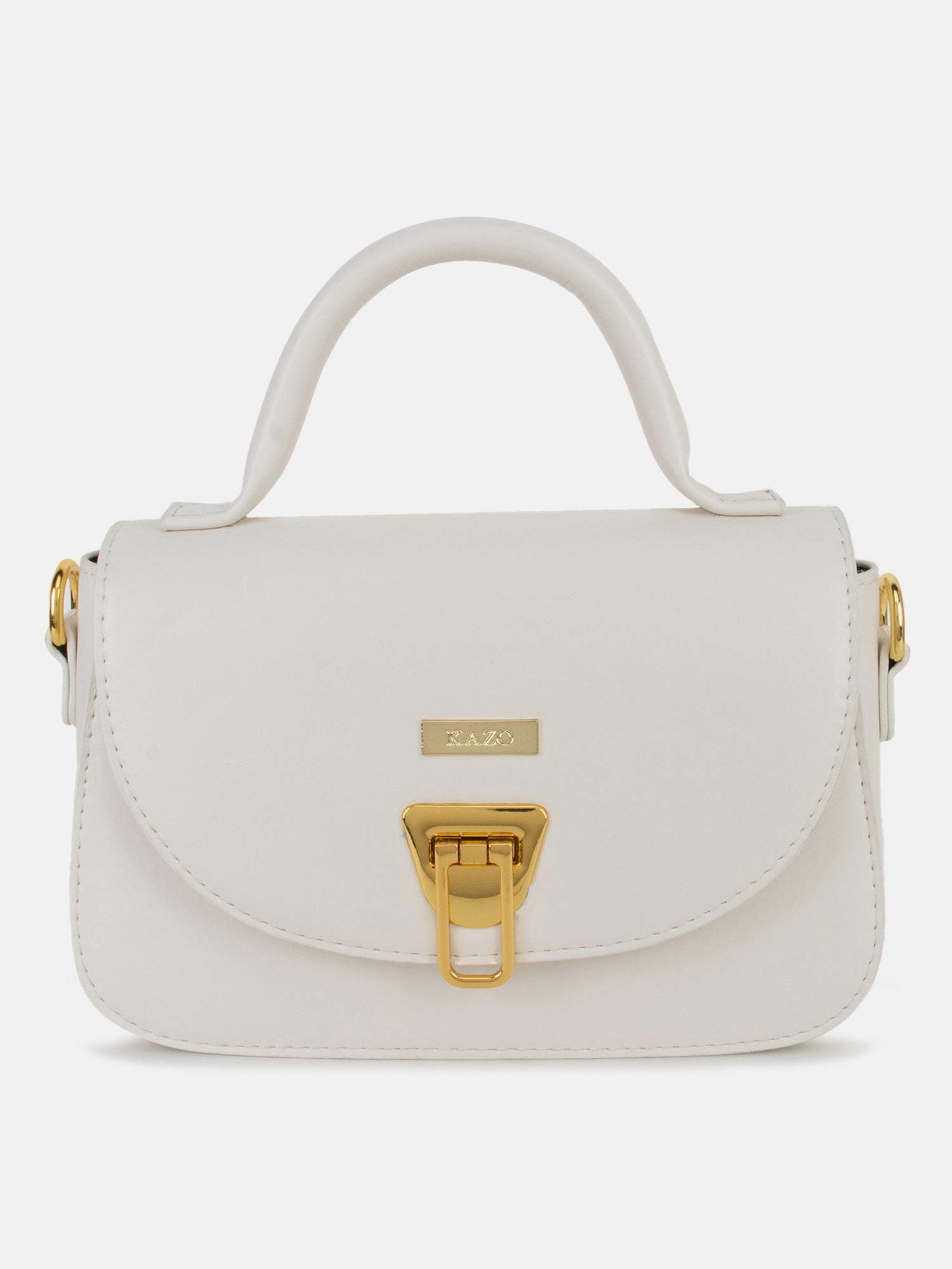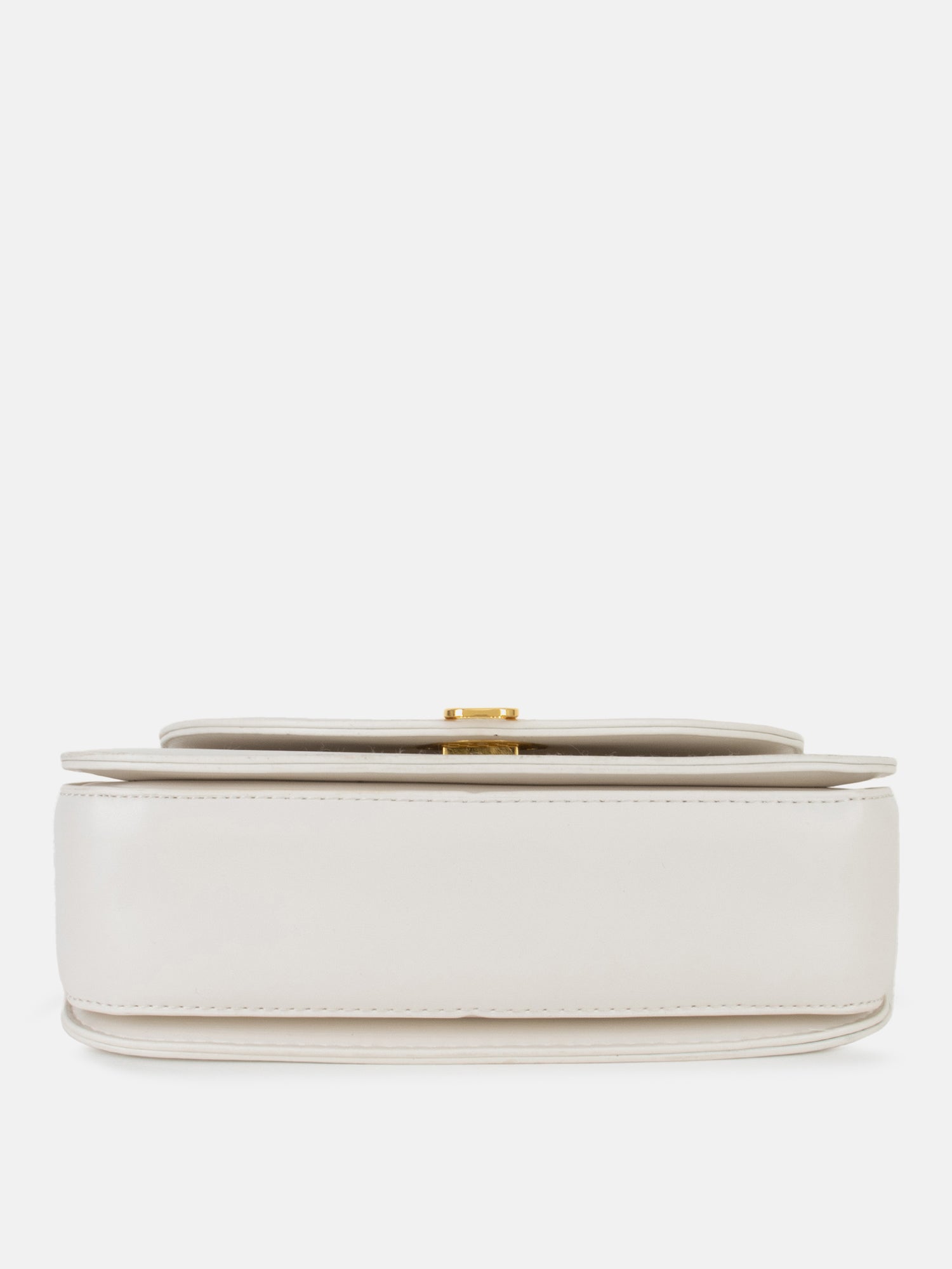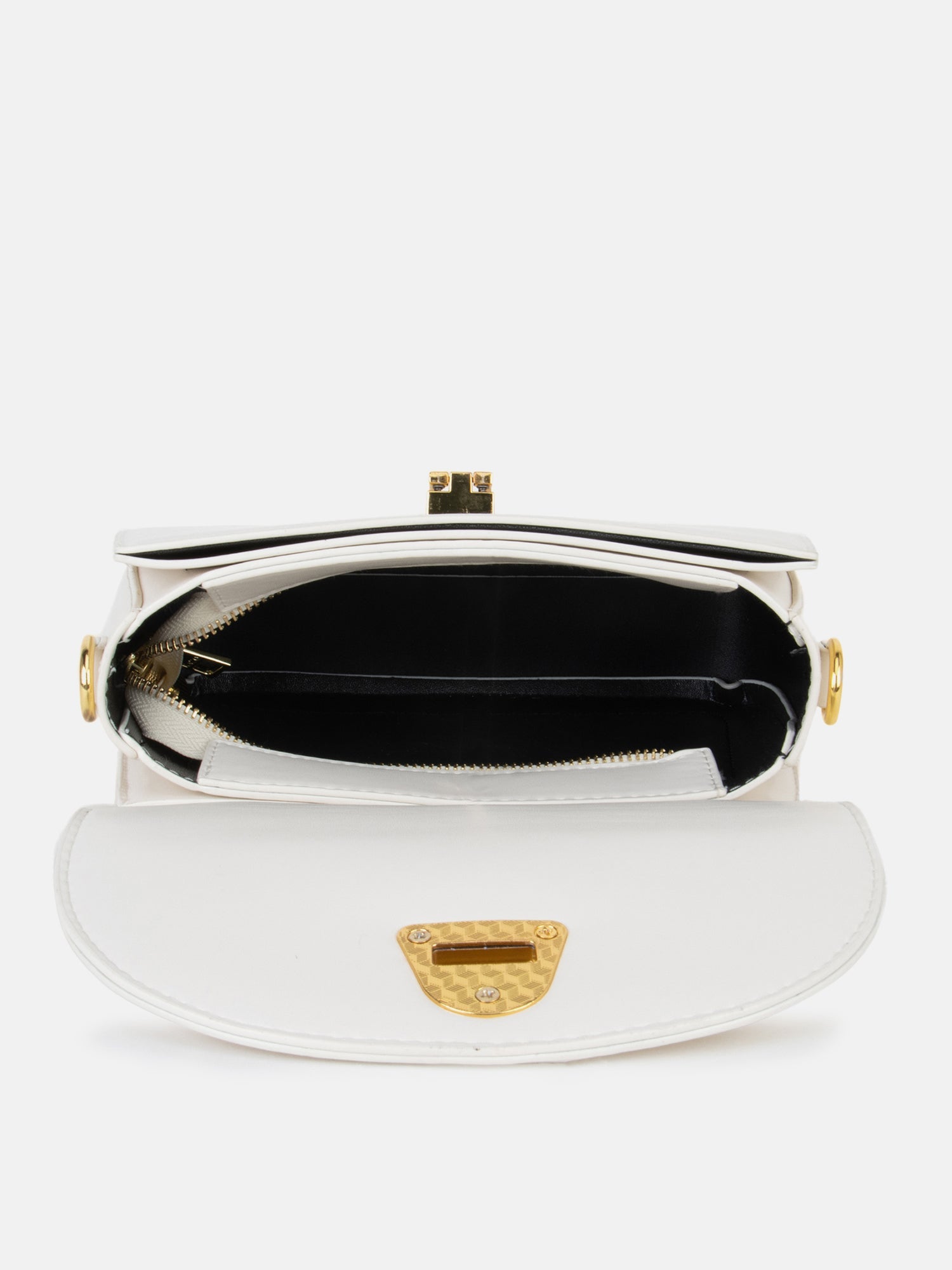 This sling bag has Structured flap with a abstract lock closure. Crossbody straps. Lined interior with pocket.