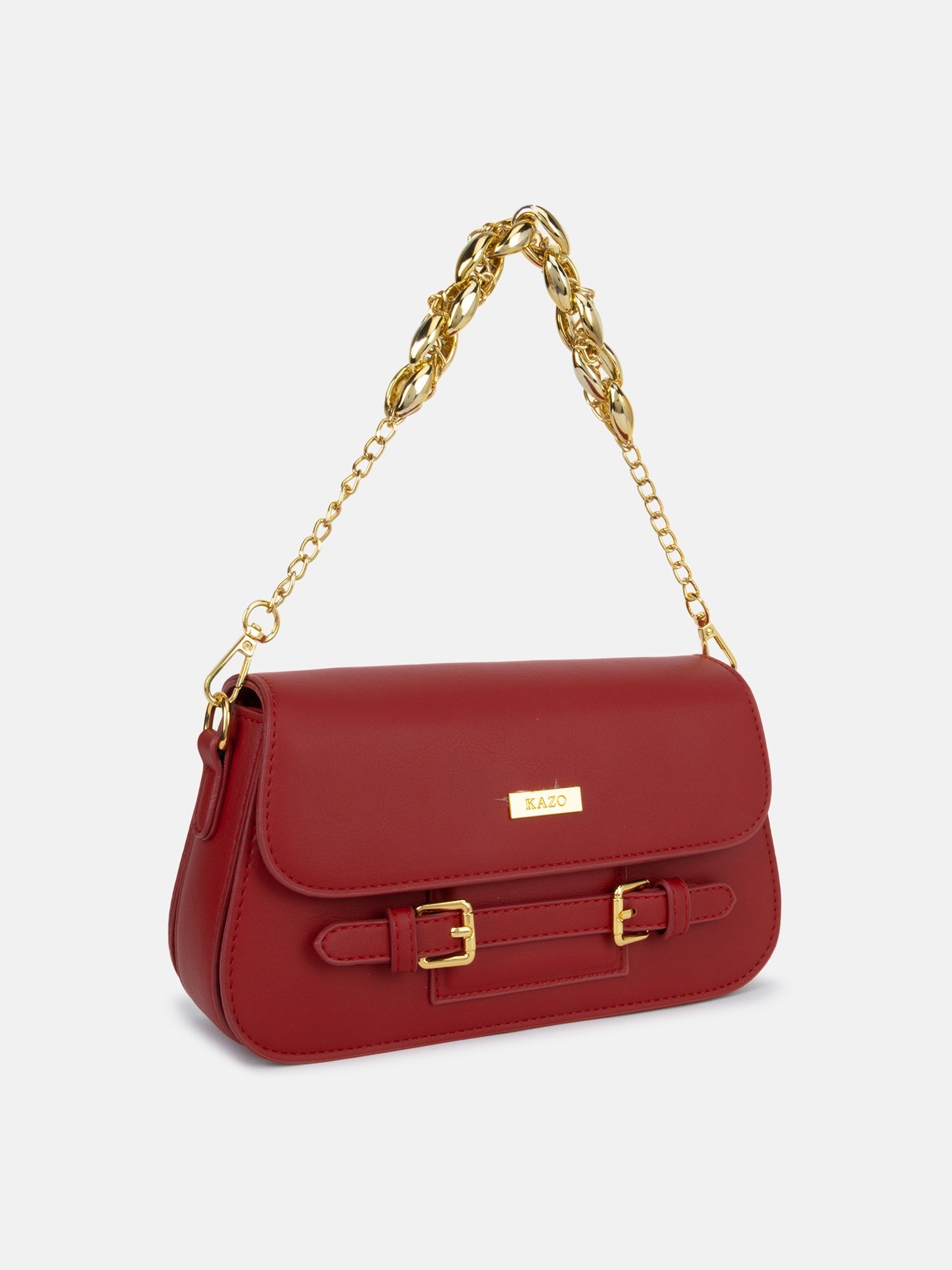 Elegant Sling with two adjustable, detachable straps, Double buckle detail on the front. Lined interior with pocket. Adjustable shoulder strap. Flap with magnetic clasp closure