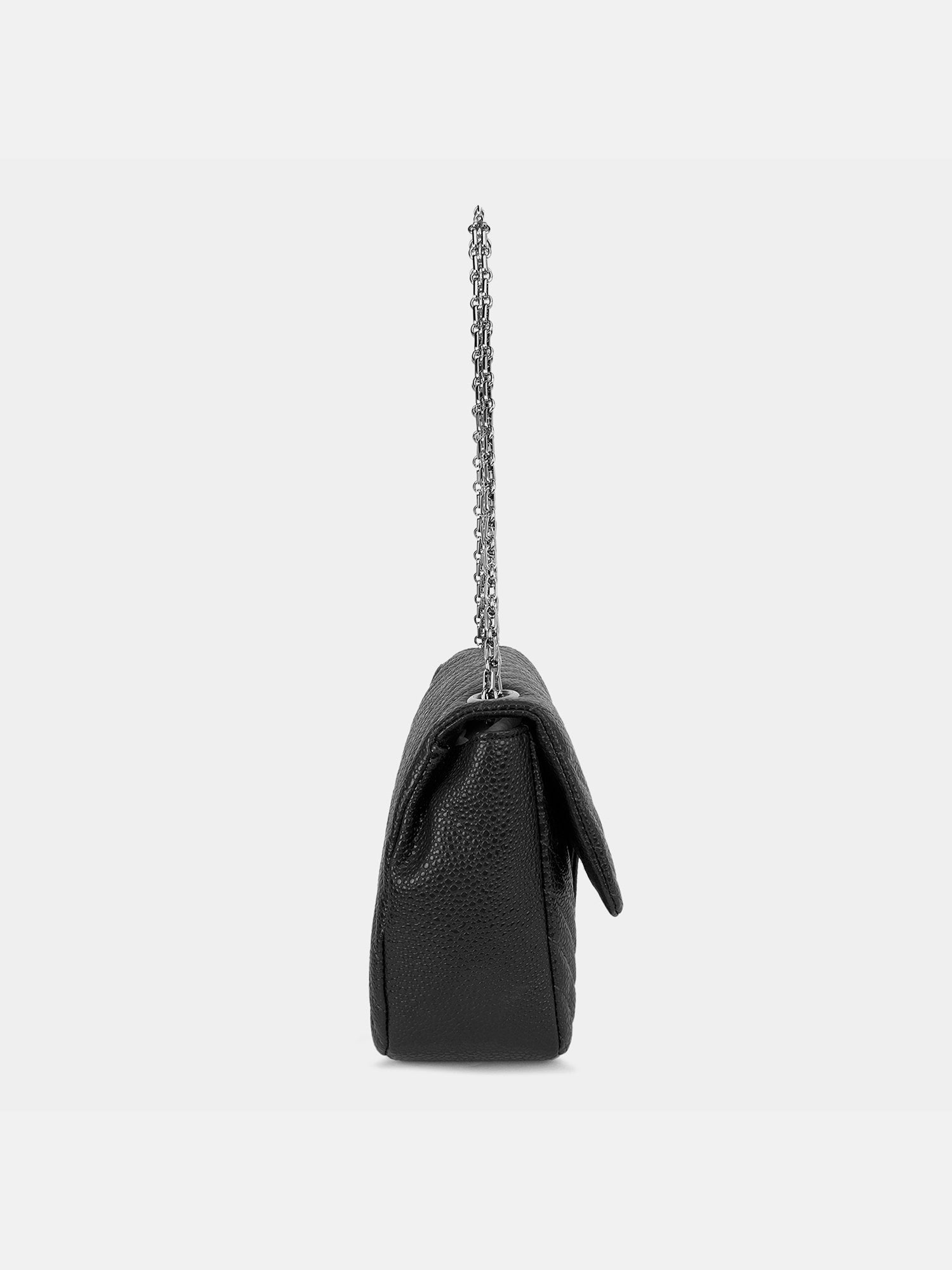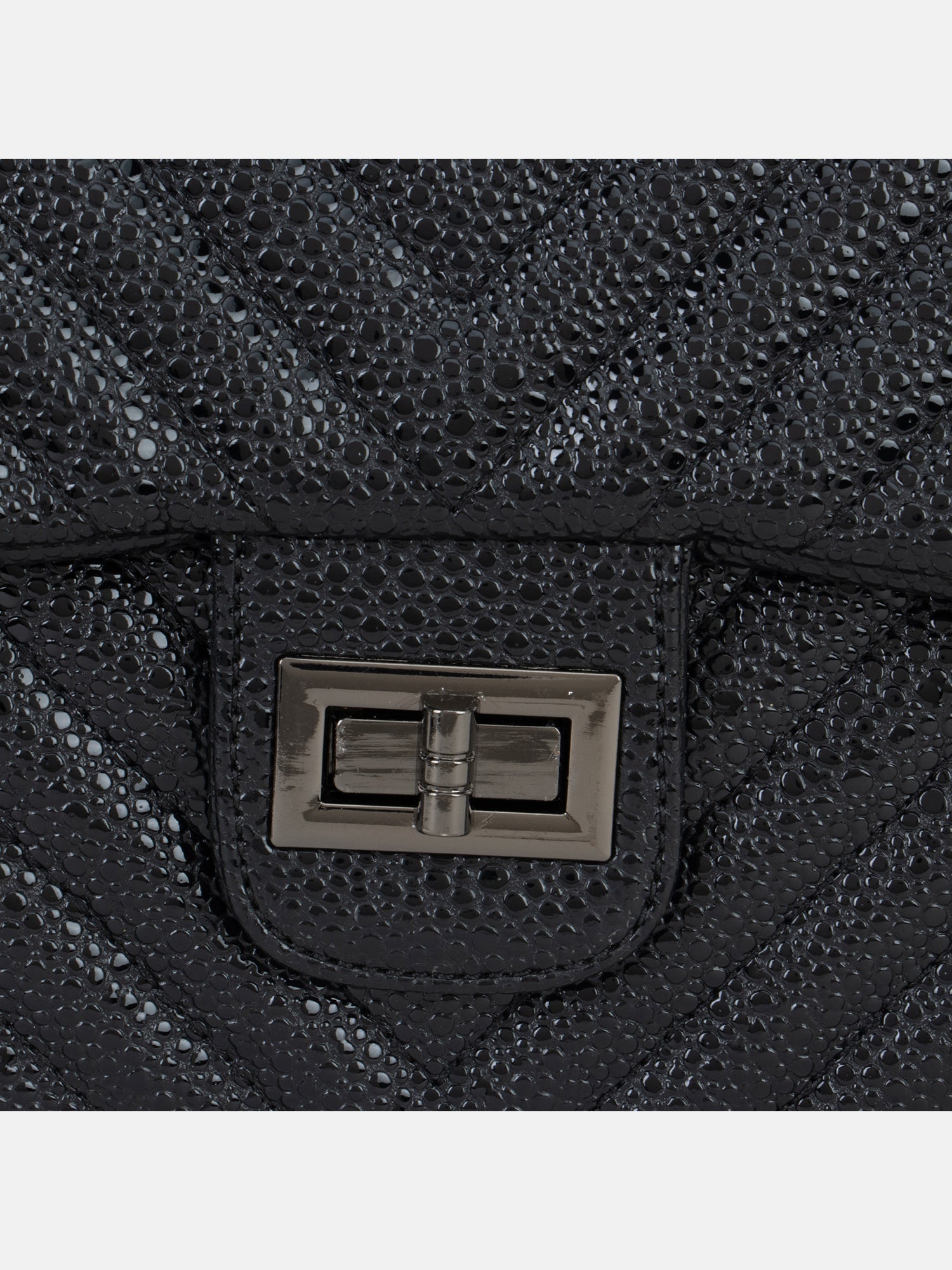 Sparkle quilting sling bag with twisted lock details. Heavy chain shoulder strap. Lined interior with pockets.