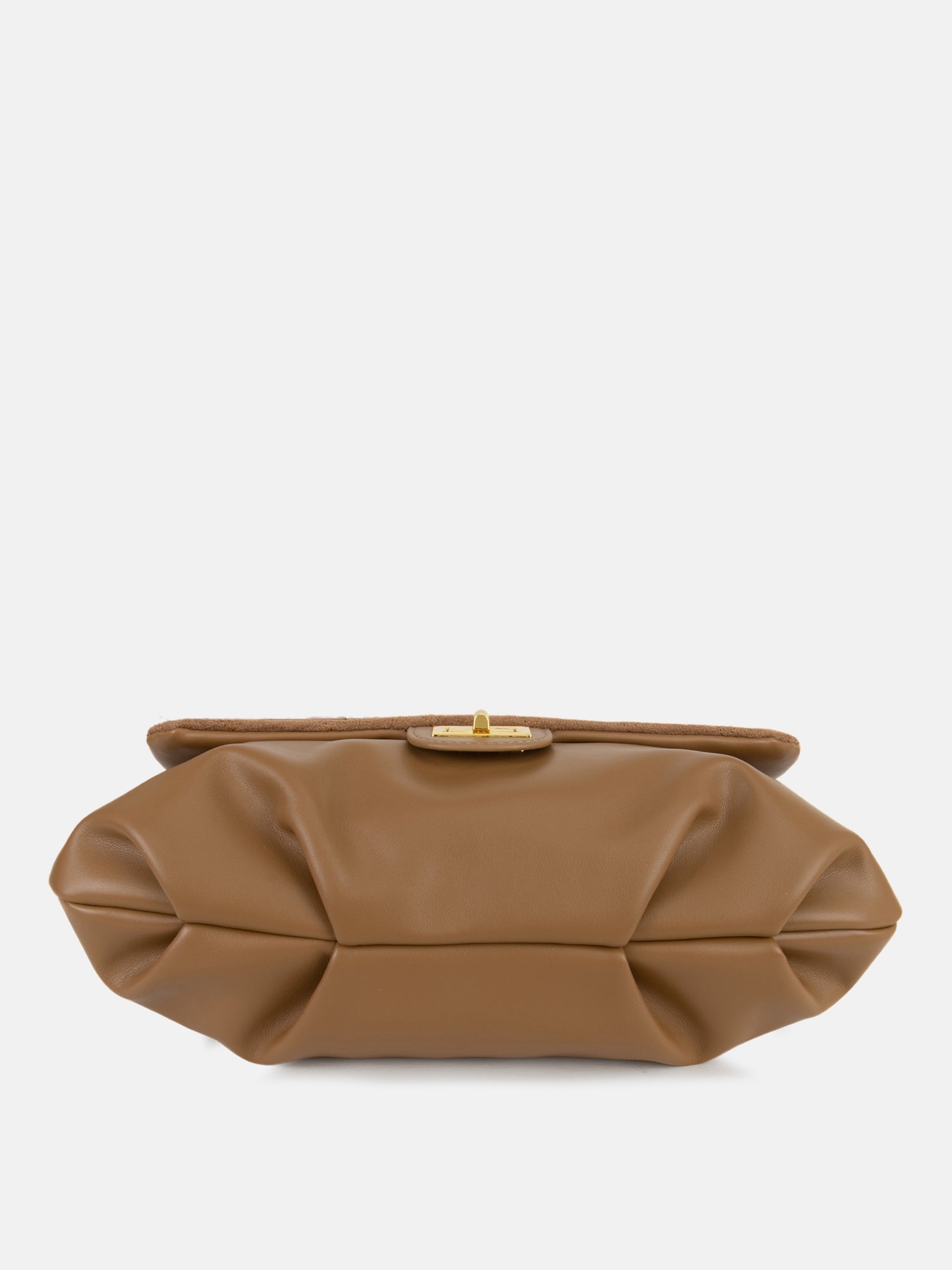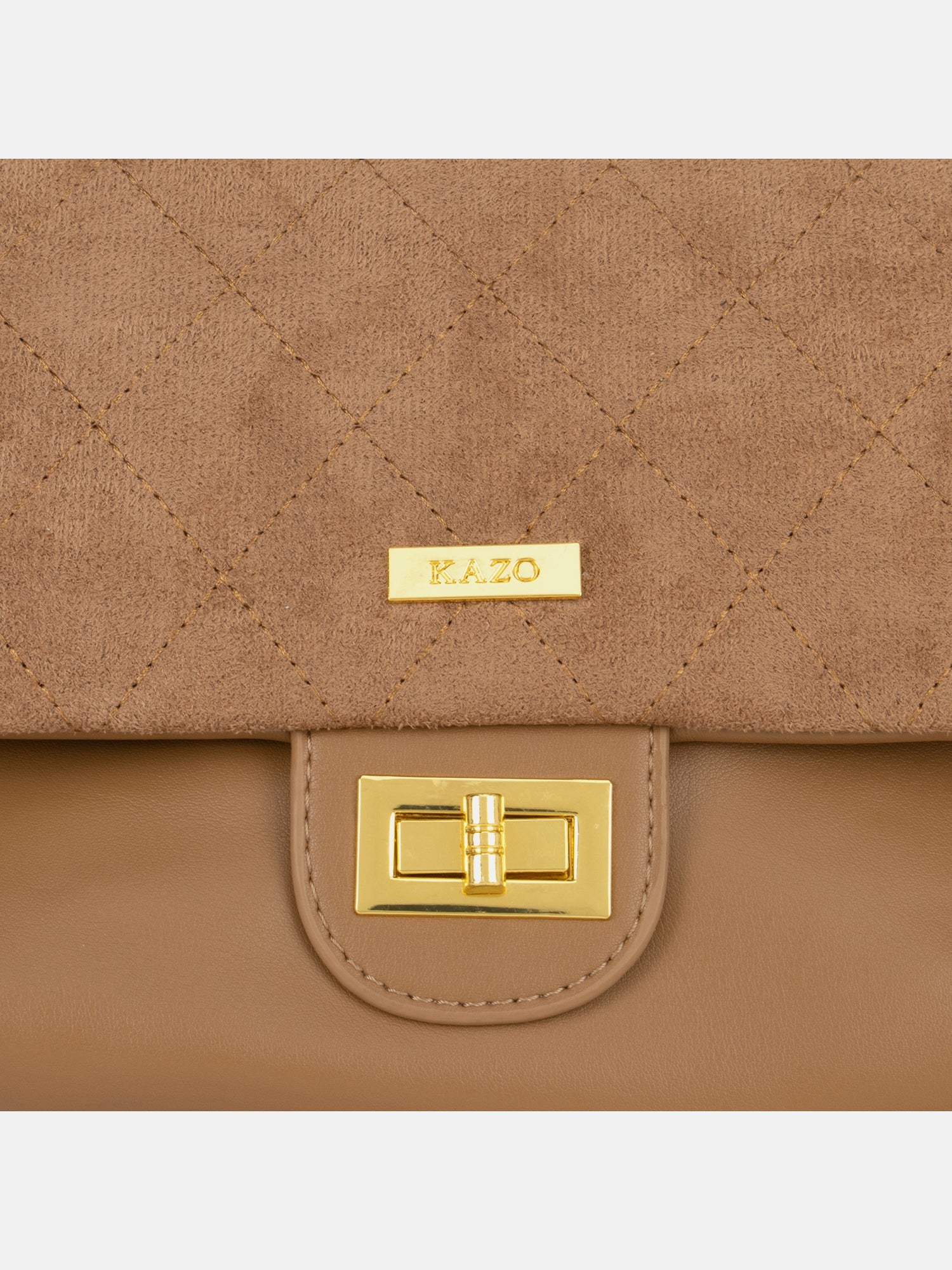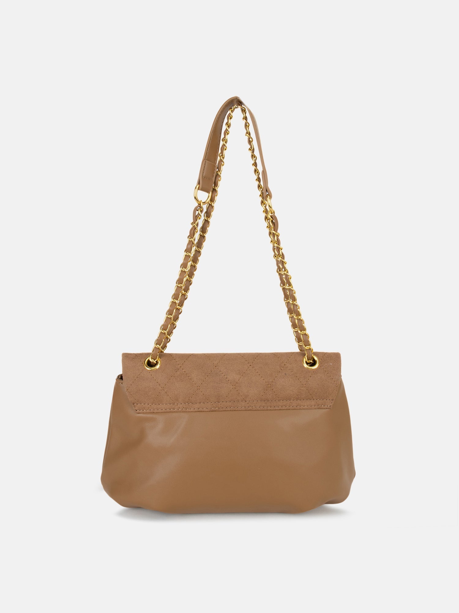 Soft faux leather bag with suede flap. Weaved shoulder strap chain . Lined interior with pockets.