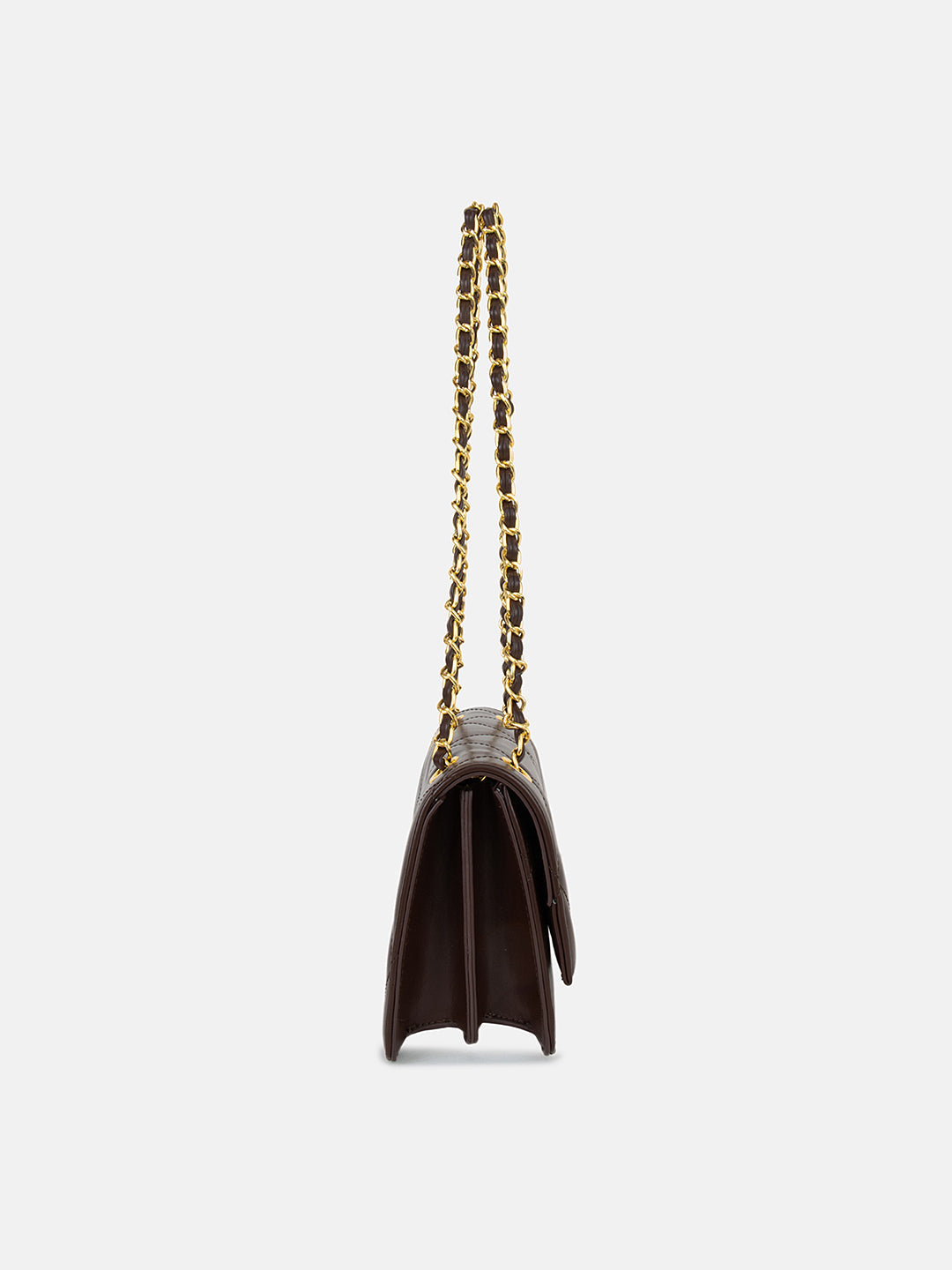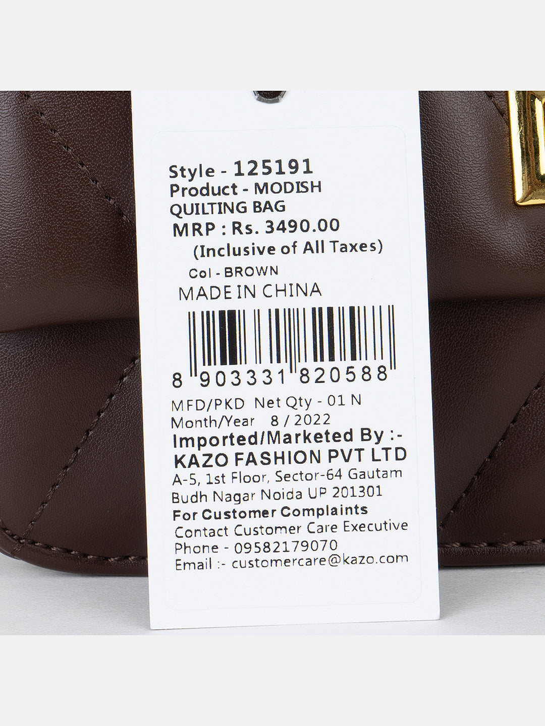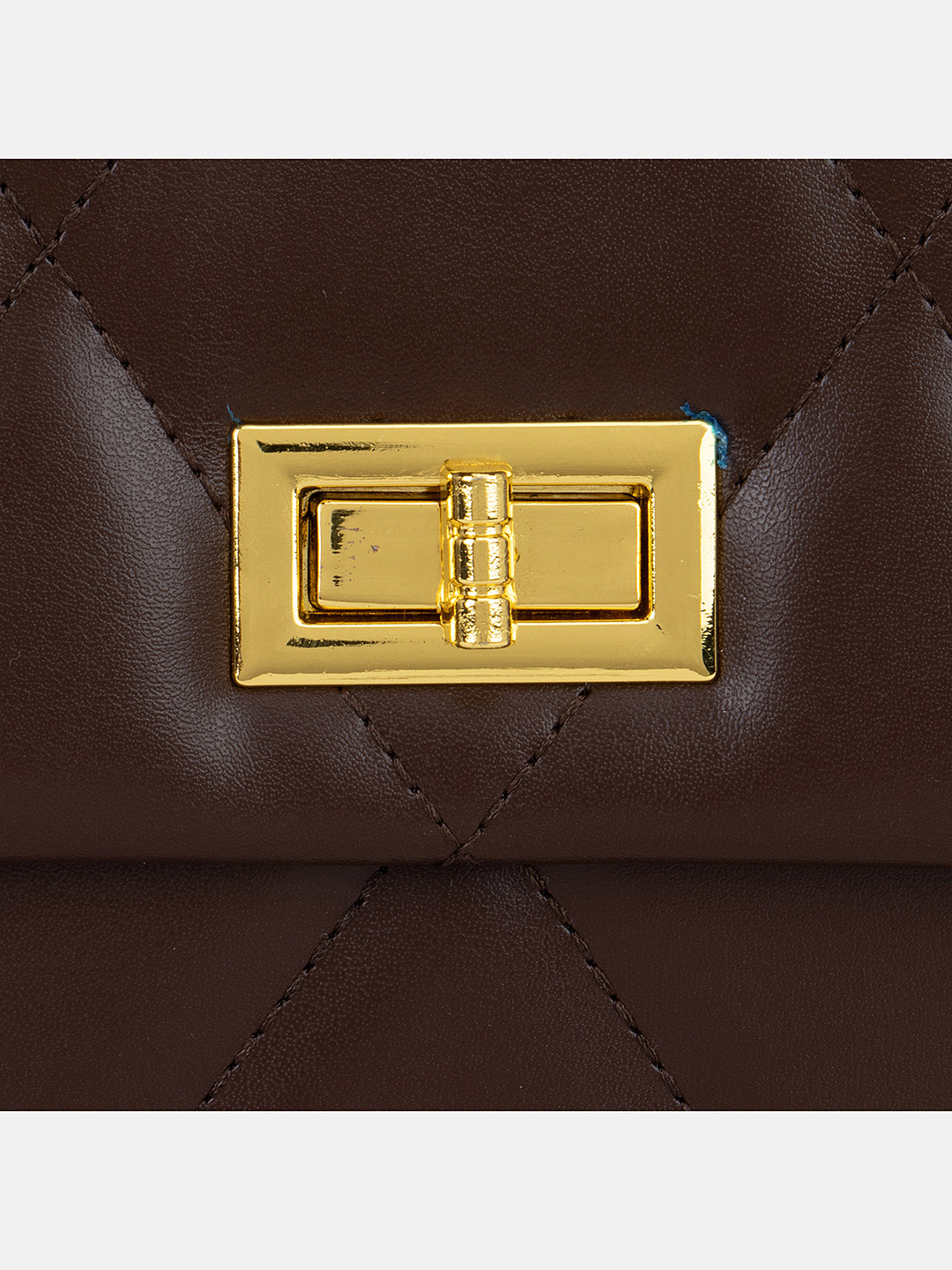 Modish heavy quilting bag, with very elegant look, twisted lock. Weaved shoulder chain strap. Lined interior with pockets.