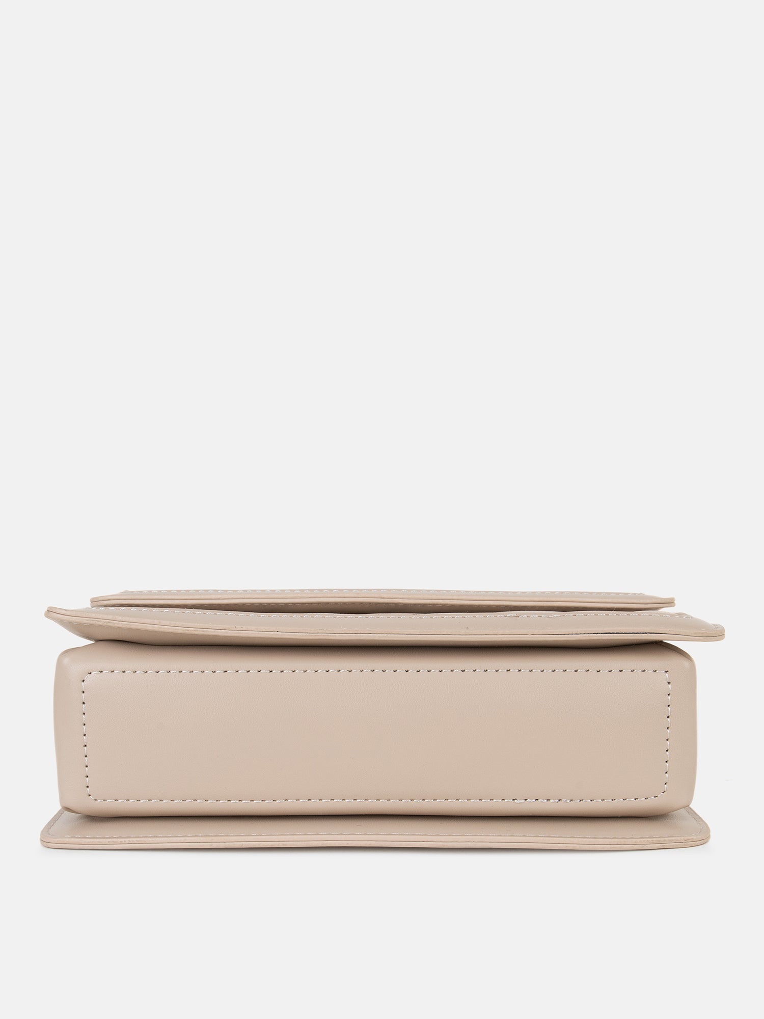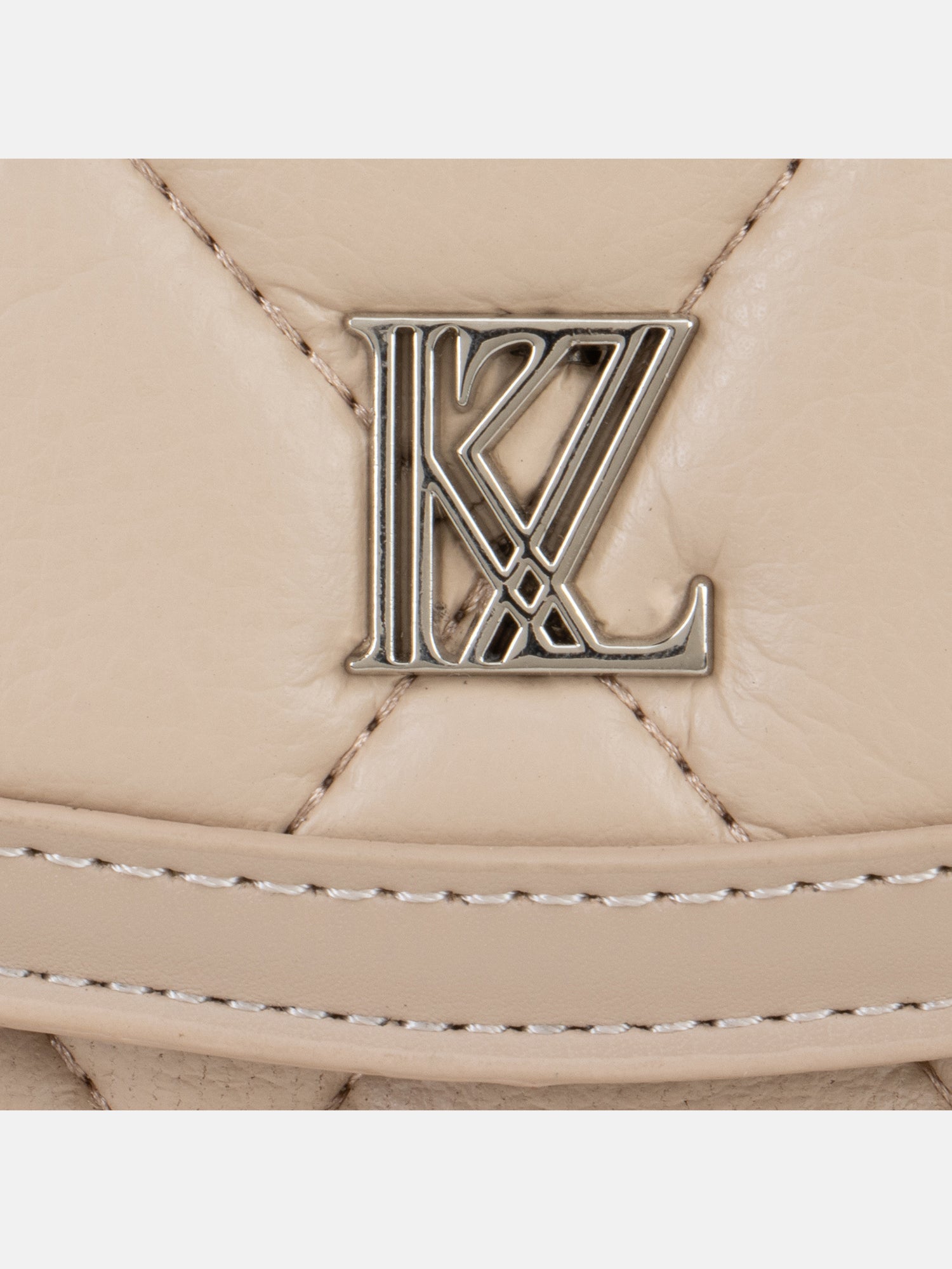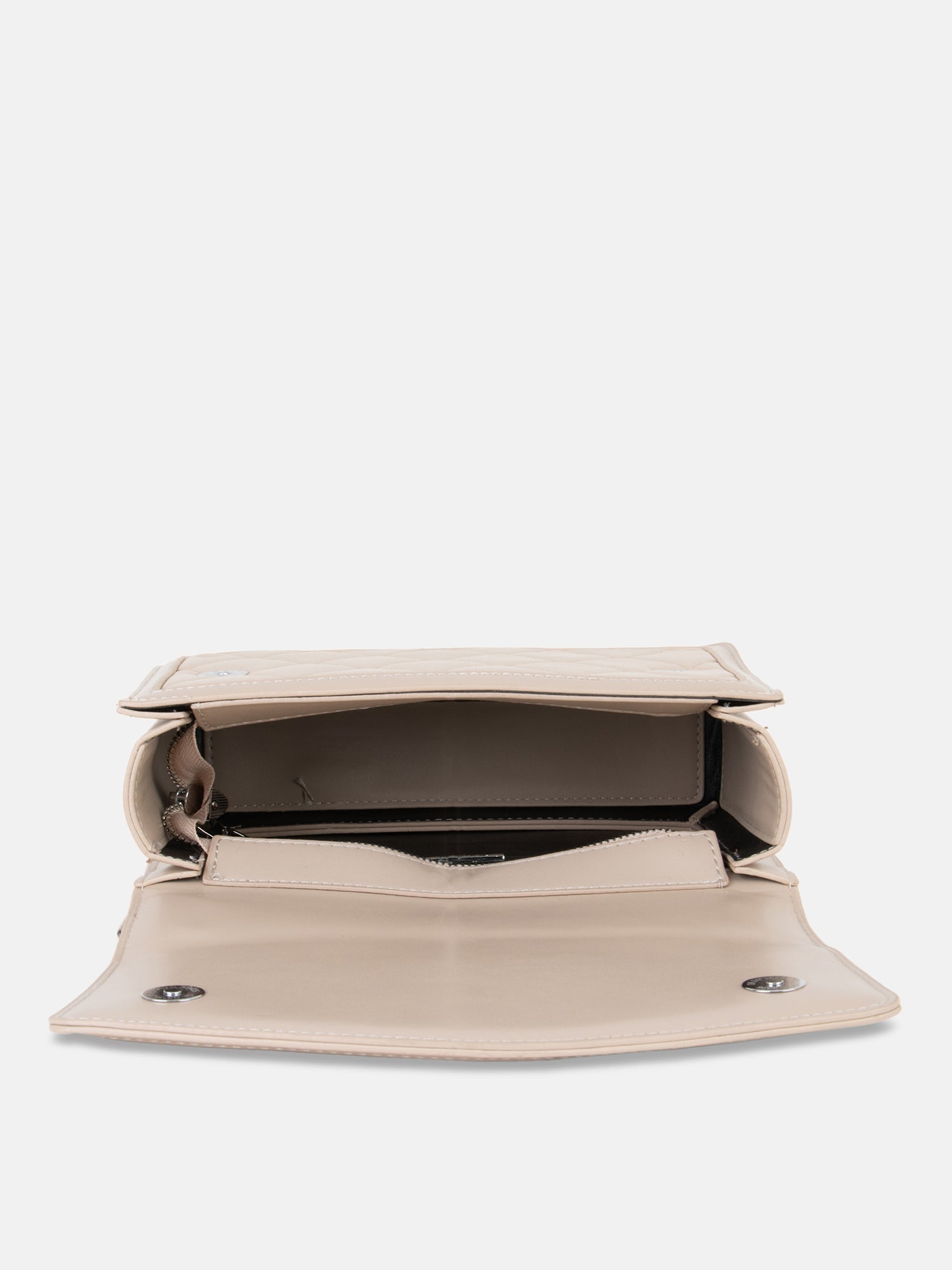 Quilting bag with contrast faux leather pipping details. Heavy chain shoulder strap. Lined interior with pockets.