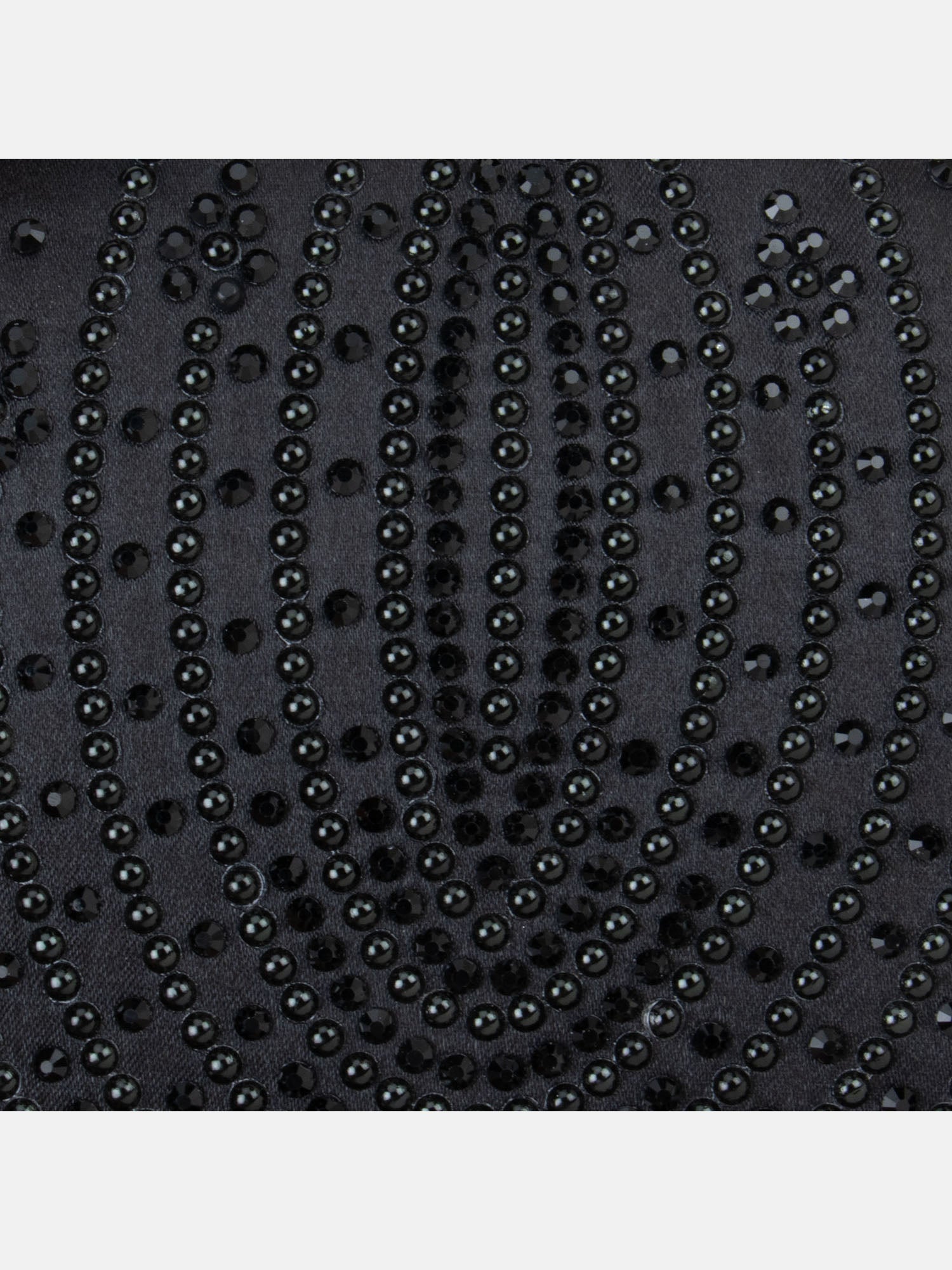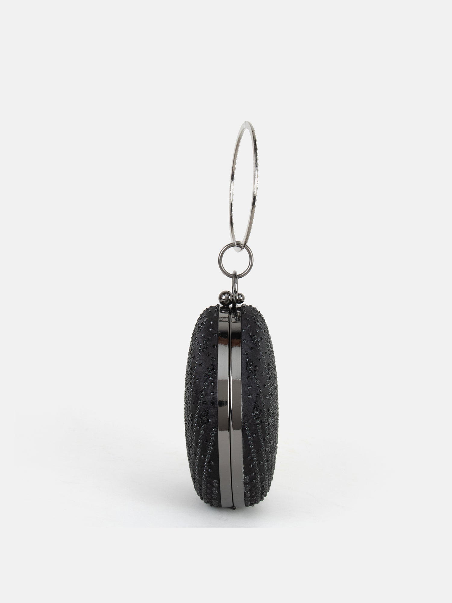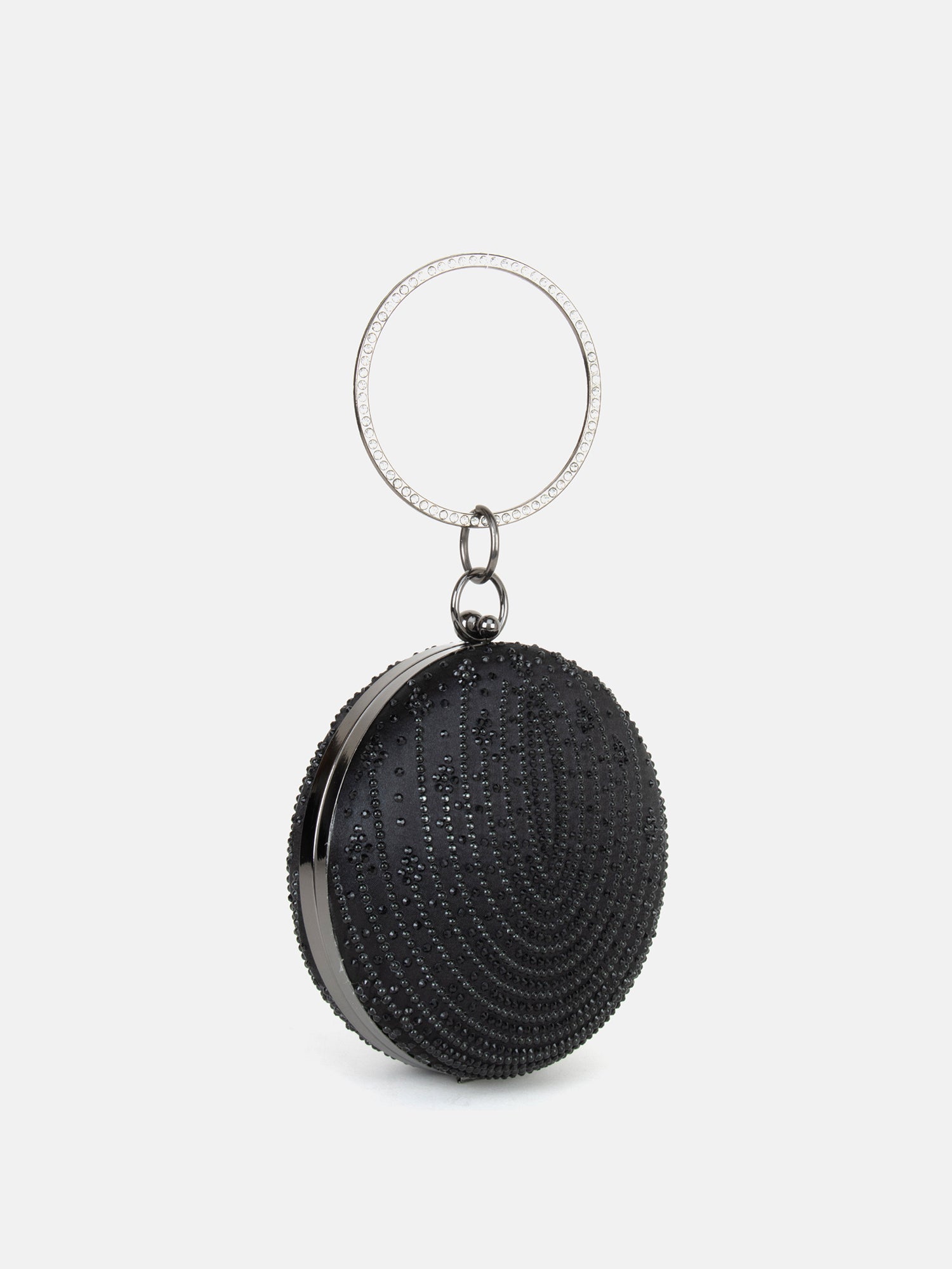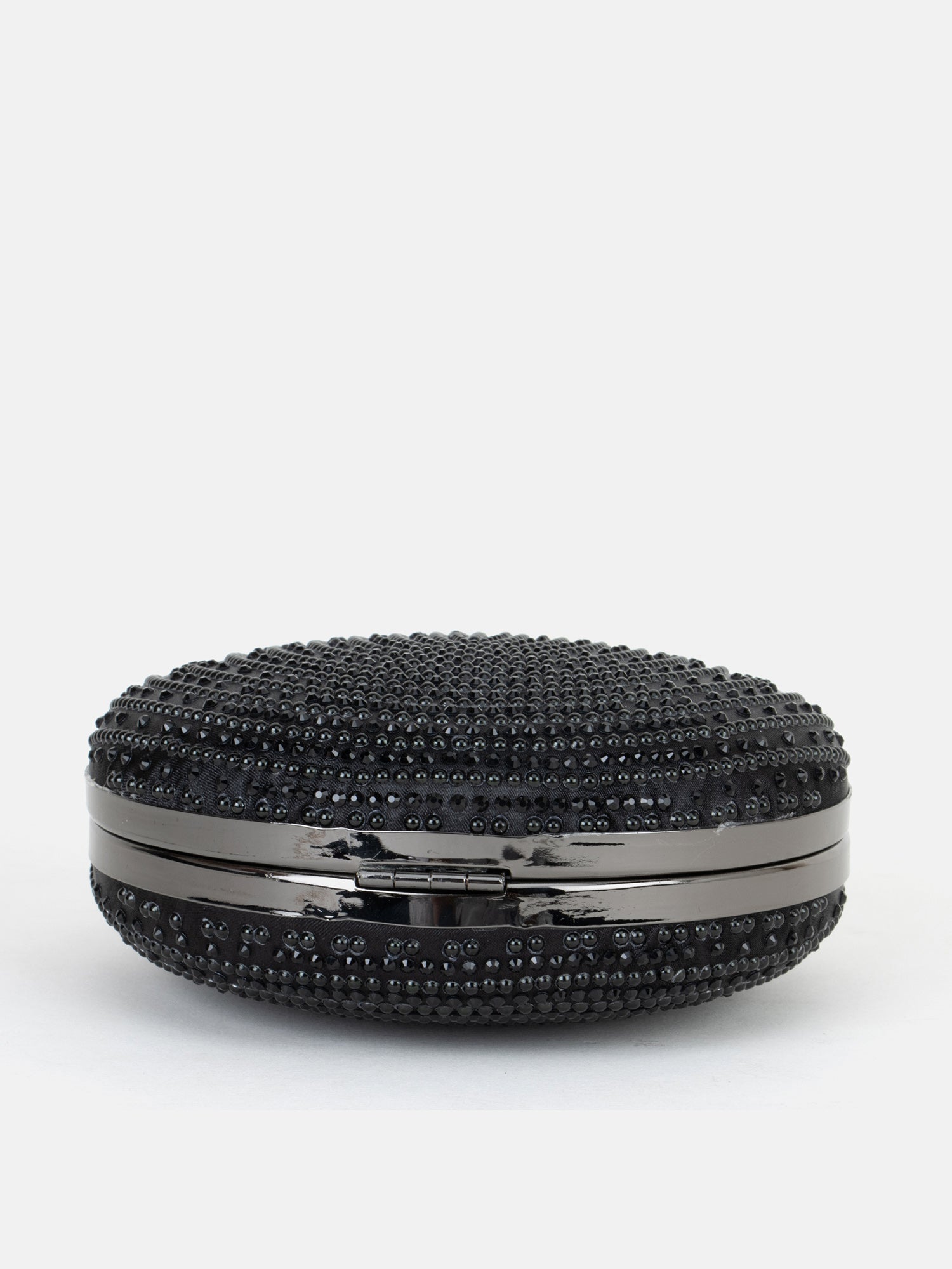 Round-shaped minaudiere clutch. Lined interior Big round handheld with embellished all over.
