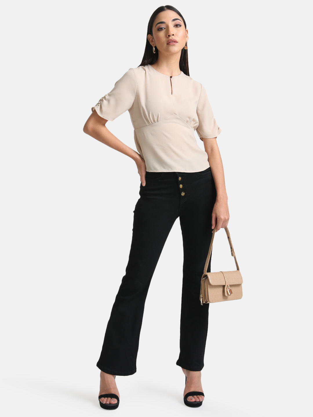 Peplum Top With Ruched Sleeve Detail and Featuring Keyhole With Button at Front.