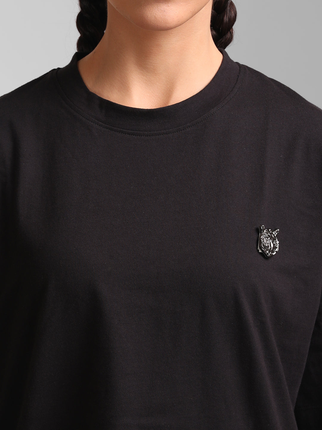 Short sleeve Women's T-shirt with a round neckline. Featuring front tiger metal trim charm and back "FIERCE" printed graphic.
