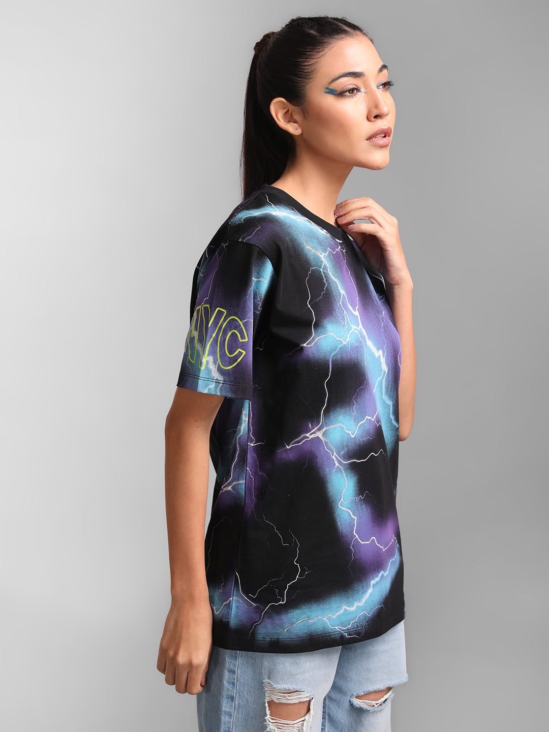 Short sleeve Women's t-shirt with a round neckline. Featuring all over lightning printed graphic.