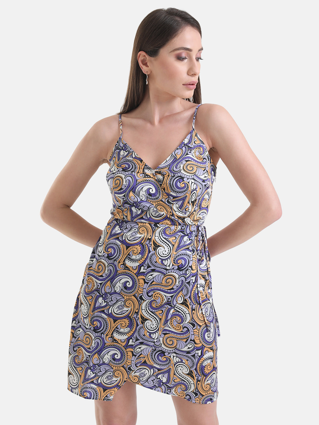 ABSTRACT PRINTED WRAP MINI DRESS WITH SHOULDER STRAPS. PAIR IT WITH STAPPY HEELS AND A CLUTCH FOR A POOL PARTY.