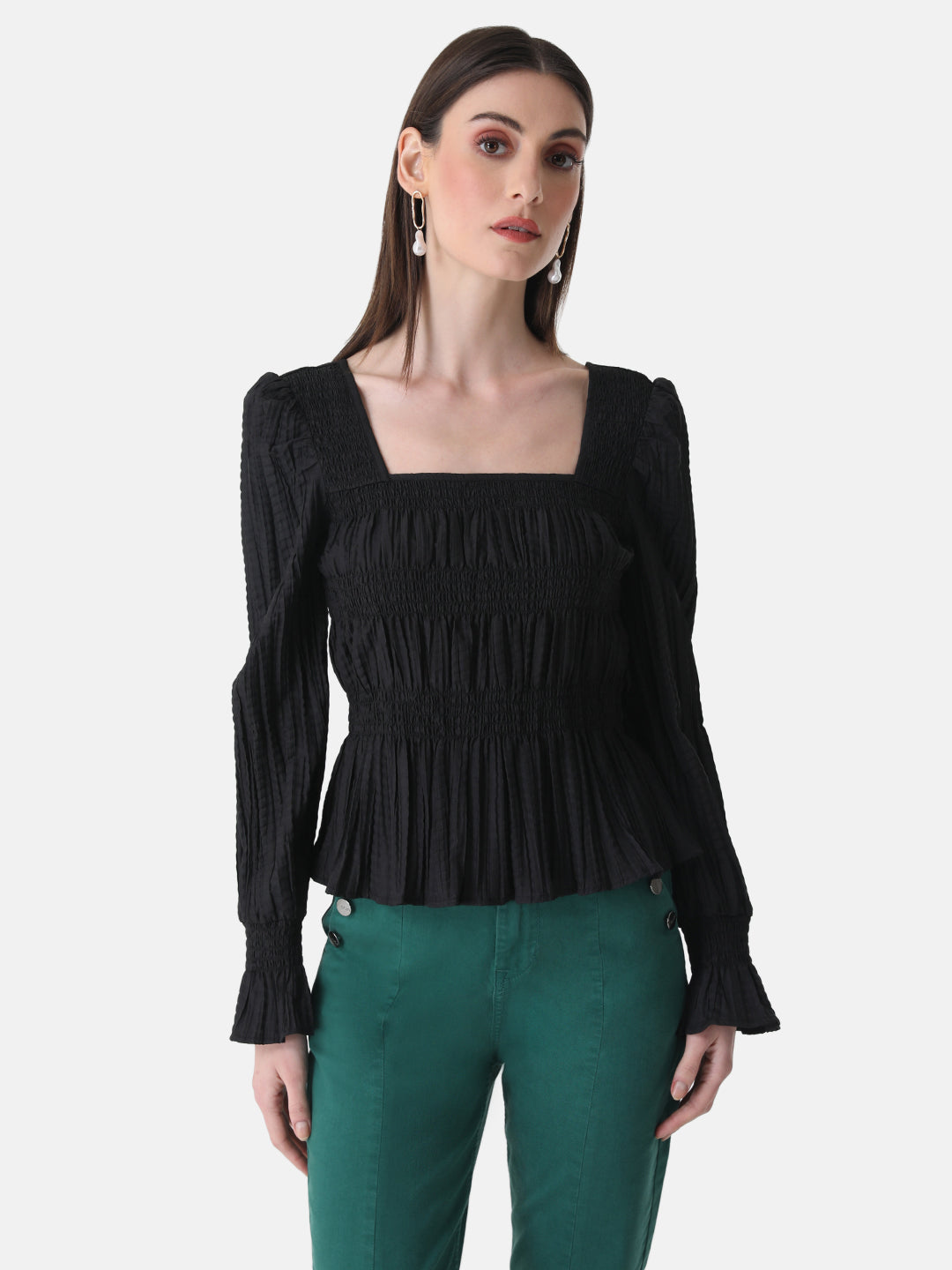 SMOCKED PLEATED TOP WITH PUFF SLEEVES. PAIR IT WITH FITTED OR BELL BOTTOM JEANS FOR A TRENDY LOOK FOR A DAY OUT.