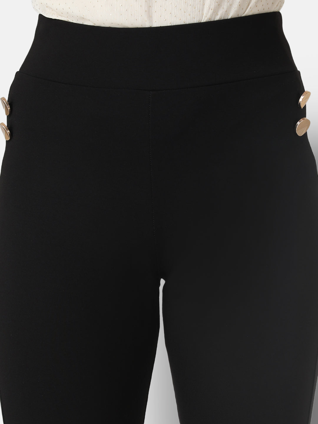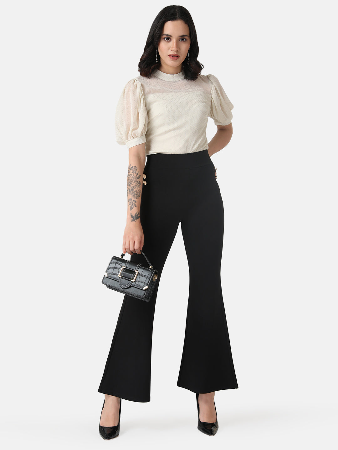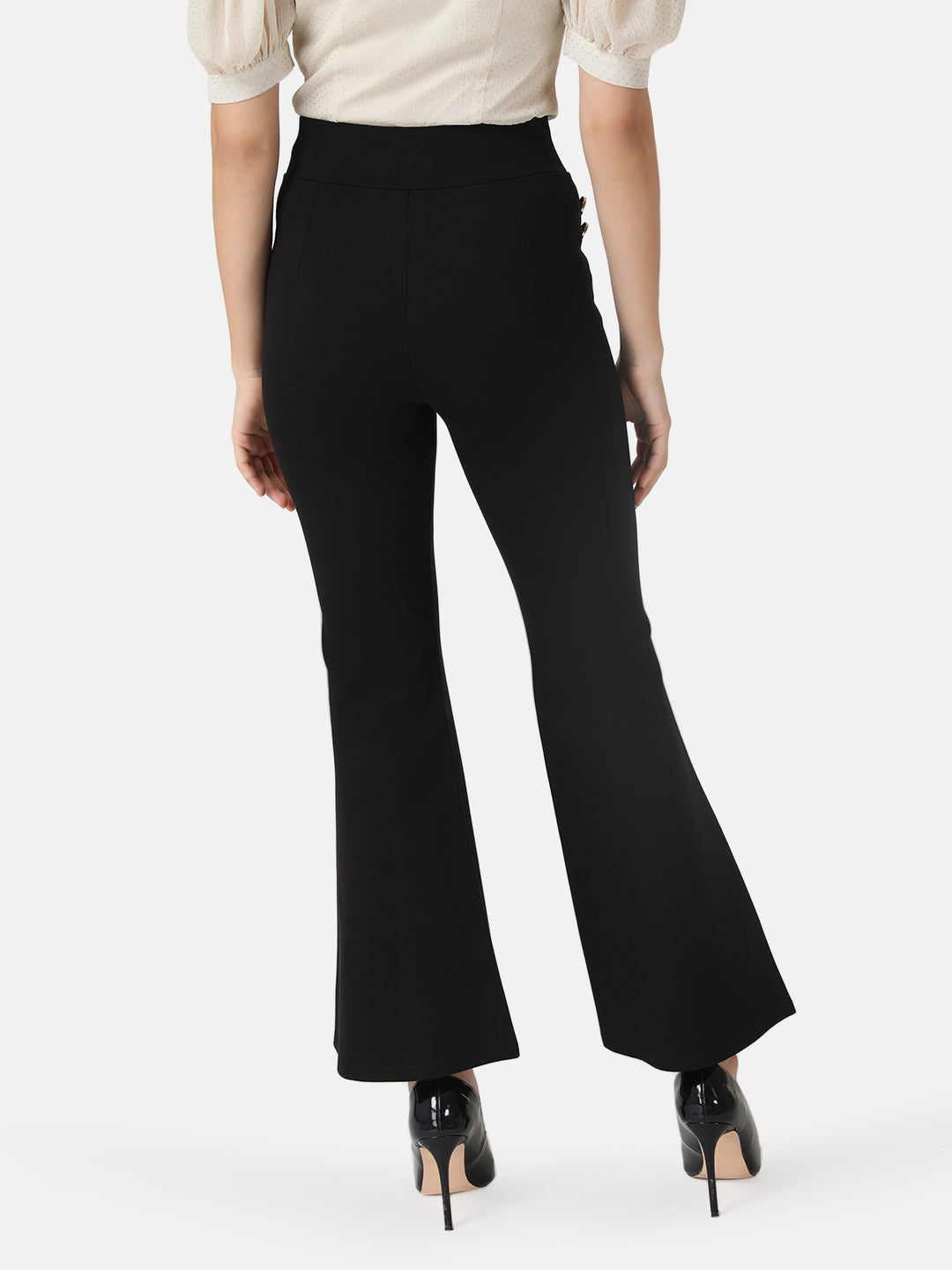 FLARED JEGGING WITH HALF MOON METAL BUTTONS. PAIR IT WITH PRINTED TUCKED-IN TOP AND POINTED HEELS FOR A CHIC WORK LOOK.