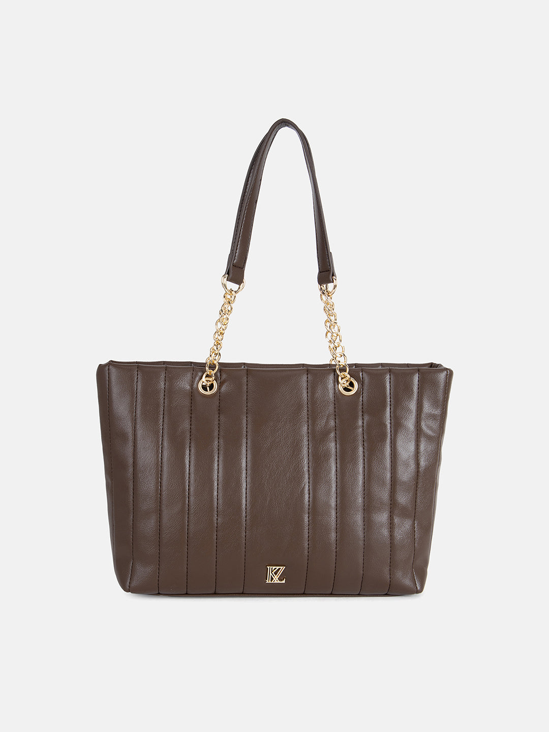 Elevate your style and utility game with our chic brown tote bag. Features a chain-detailed strap and vertically quilted PU for a fashionable edge.