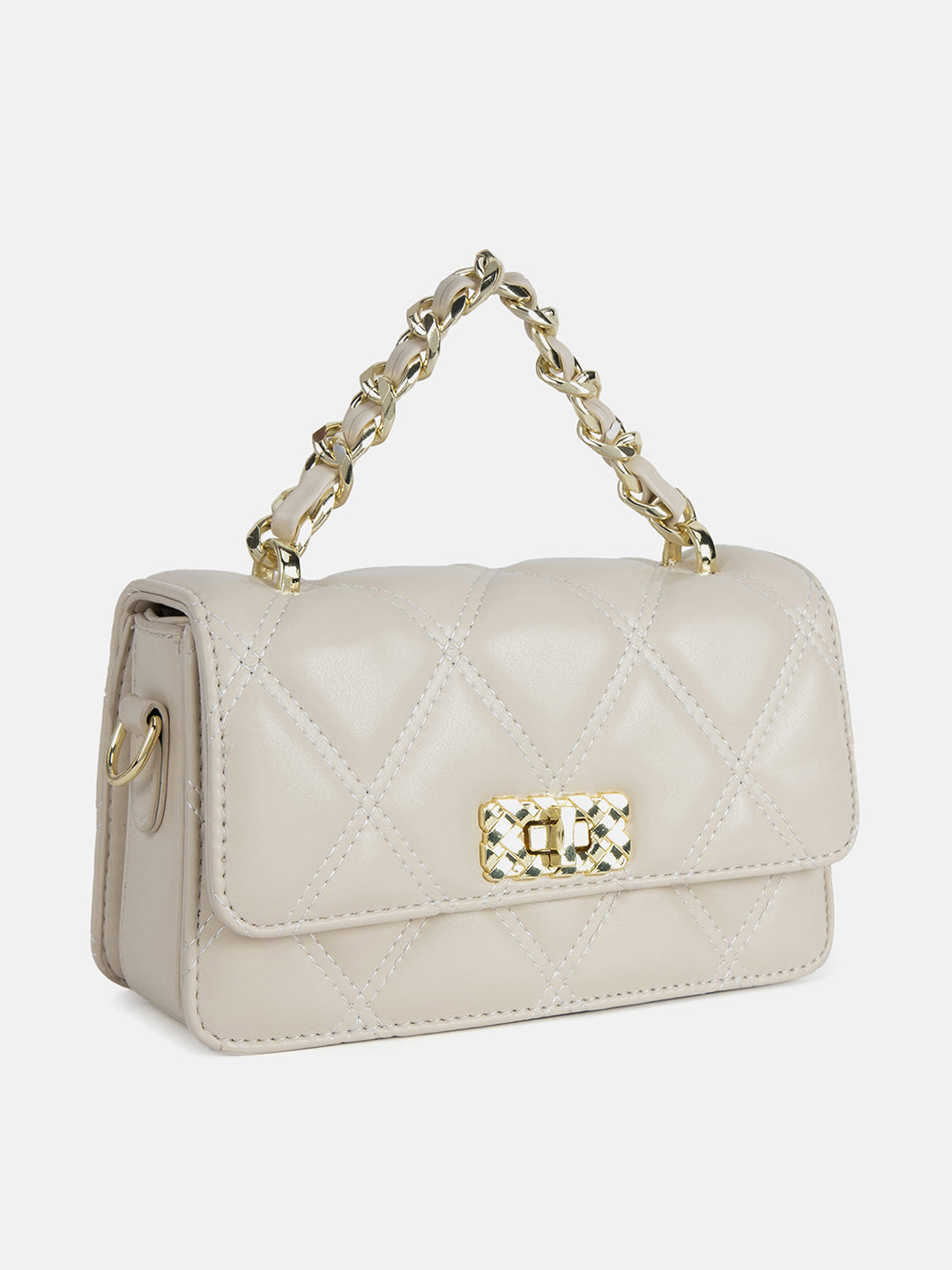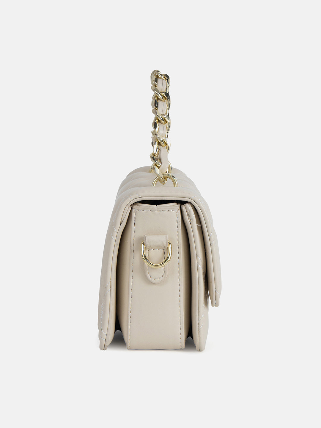 Exuding charm, the off-white quilted sling bag seamlessly merges style and durability with a PU strap adorned with metal detailing.