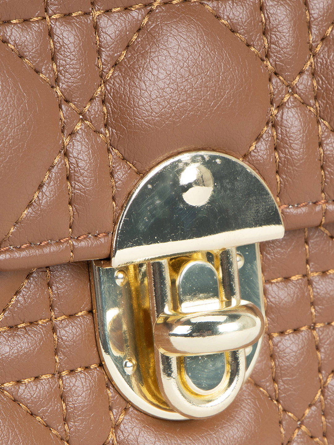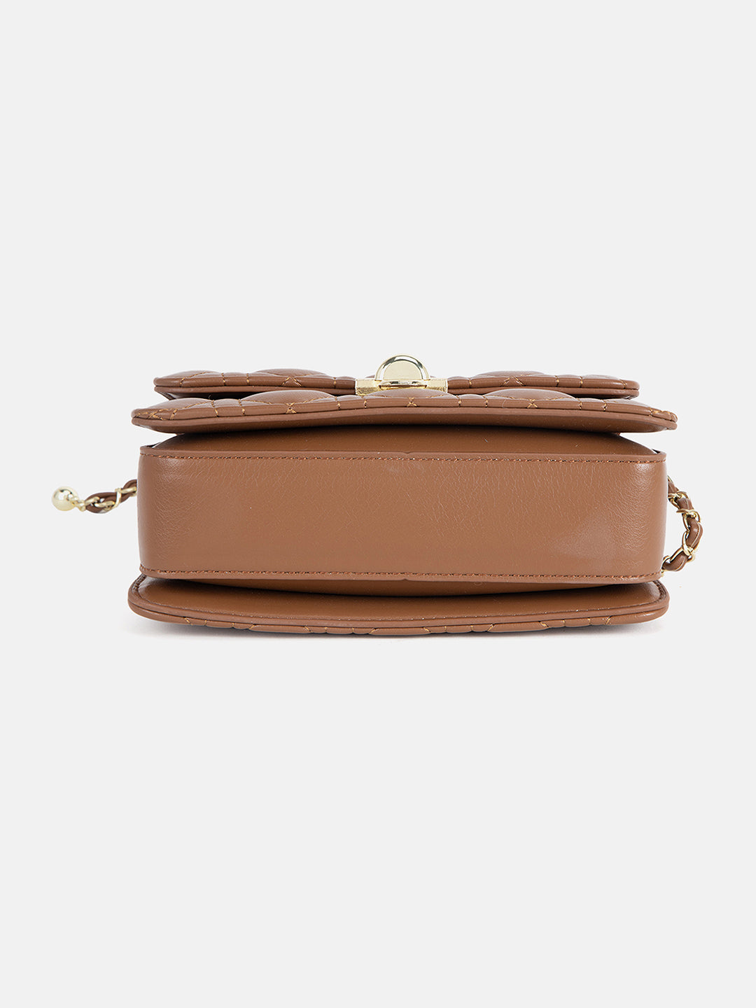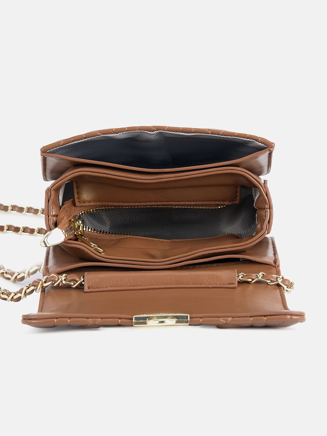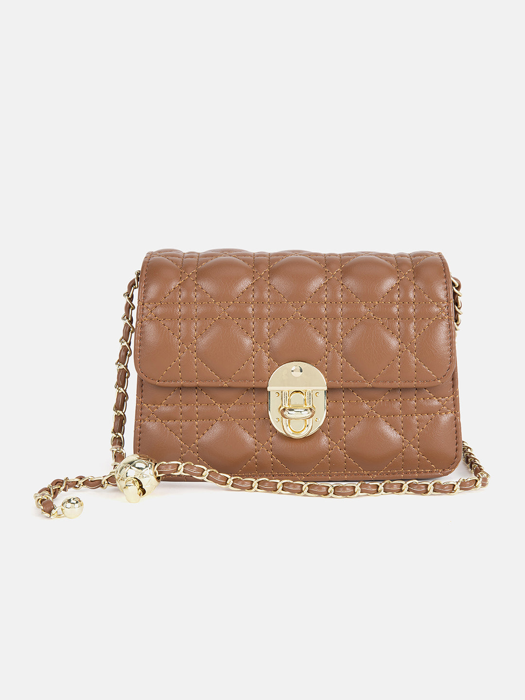 Chic and compact brown quilted sling bag. A metal buckle closure meets a high-end PU-detailed chain, defining luxury in convenience.