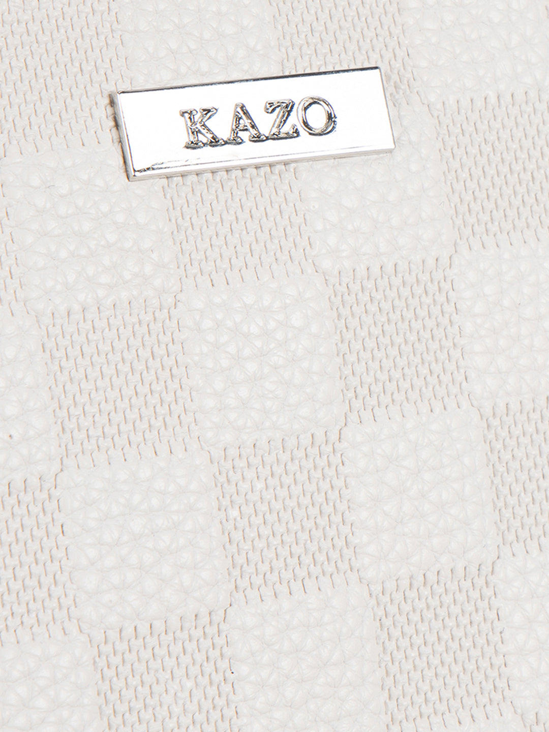 Petite white handbag in check-textured PU, boasts a sturdy handle and multiple metal chains for a stylish and versatile appearance.