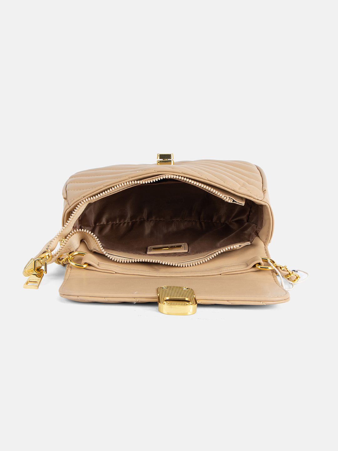 Chic small beige sling bag with a luxurious gold metal buckle closure. Diagonally quilted PU exterior exudes modern sophistication.