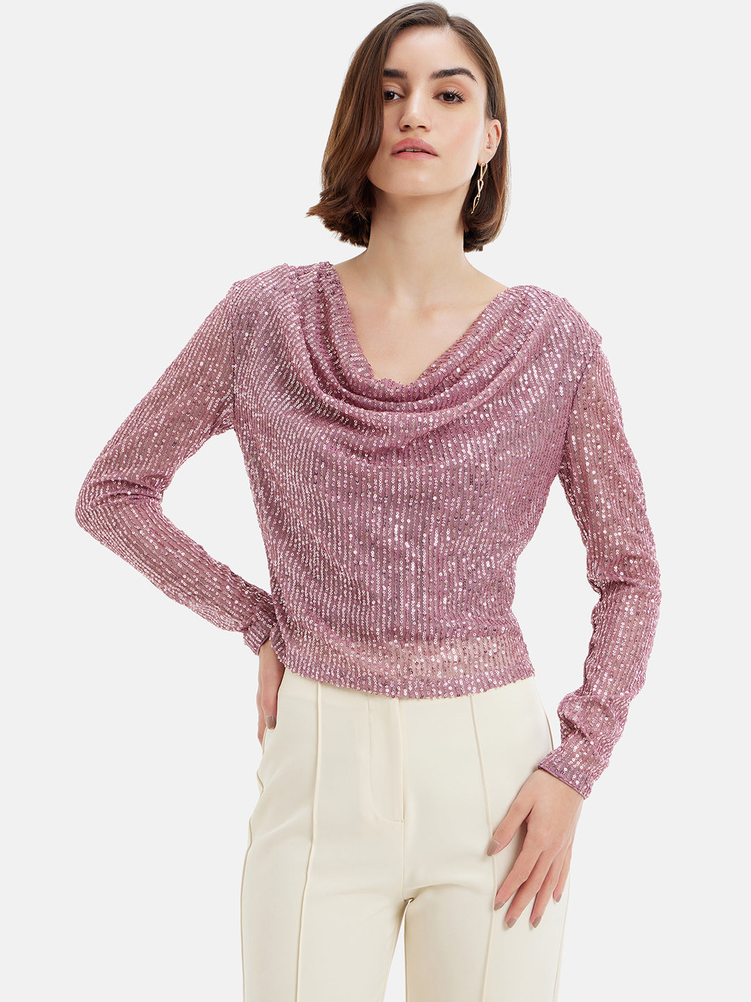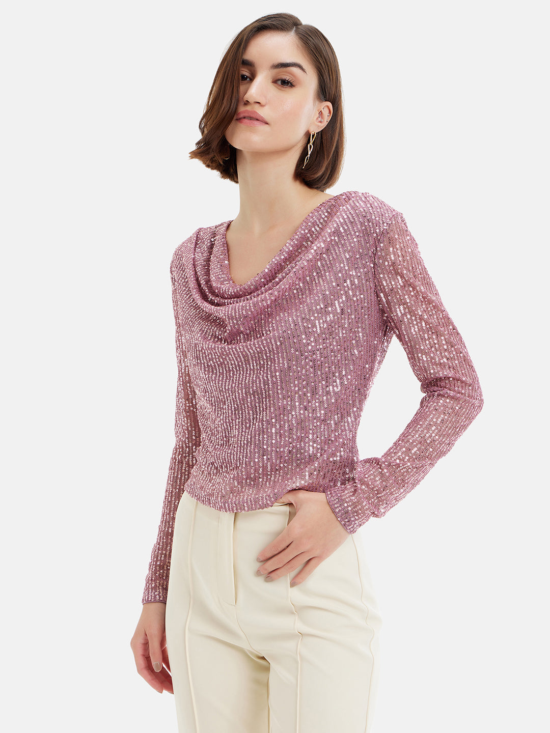 Sequin Cowl Neck Top With Full Sleeves. Pair It With Flared White Pants And Strappy Heels For A Day Party.