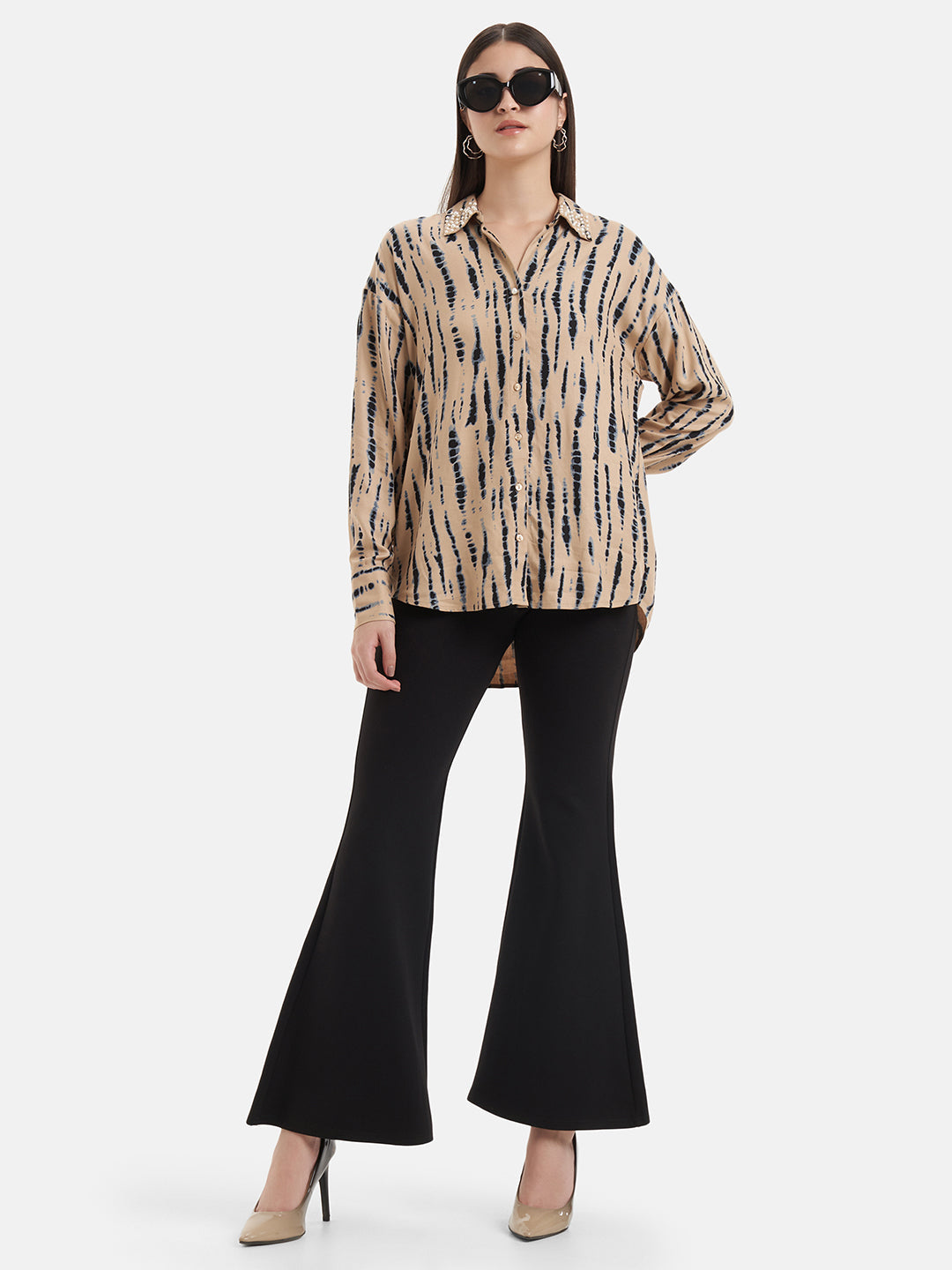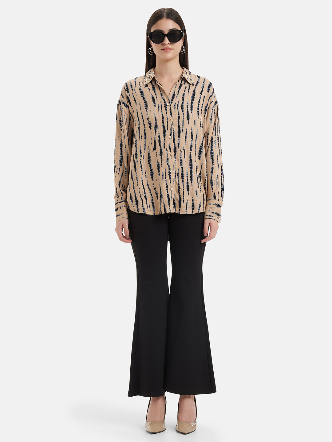 Tie & Dye Printed Shirt With Hand Embellishment At Collar. Pair It With Matching Trousers And Flats For An Easy Breezy Brunch Date.
