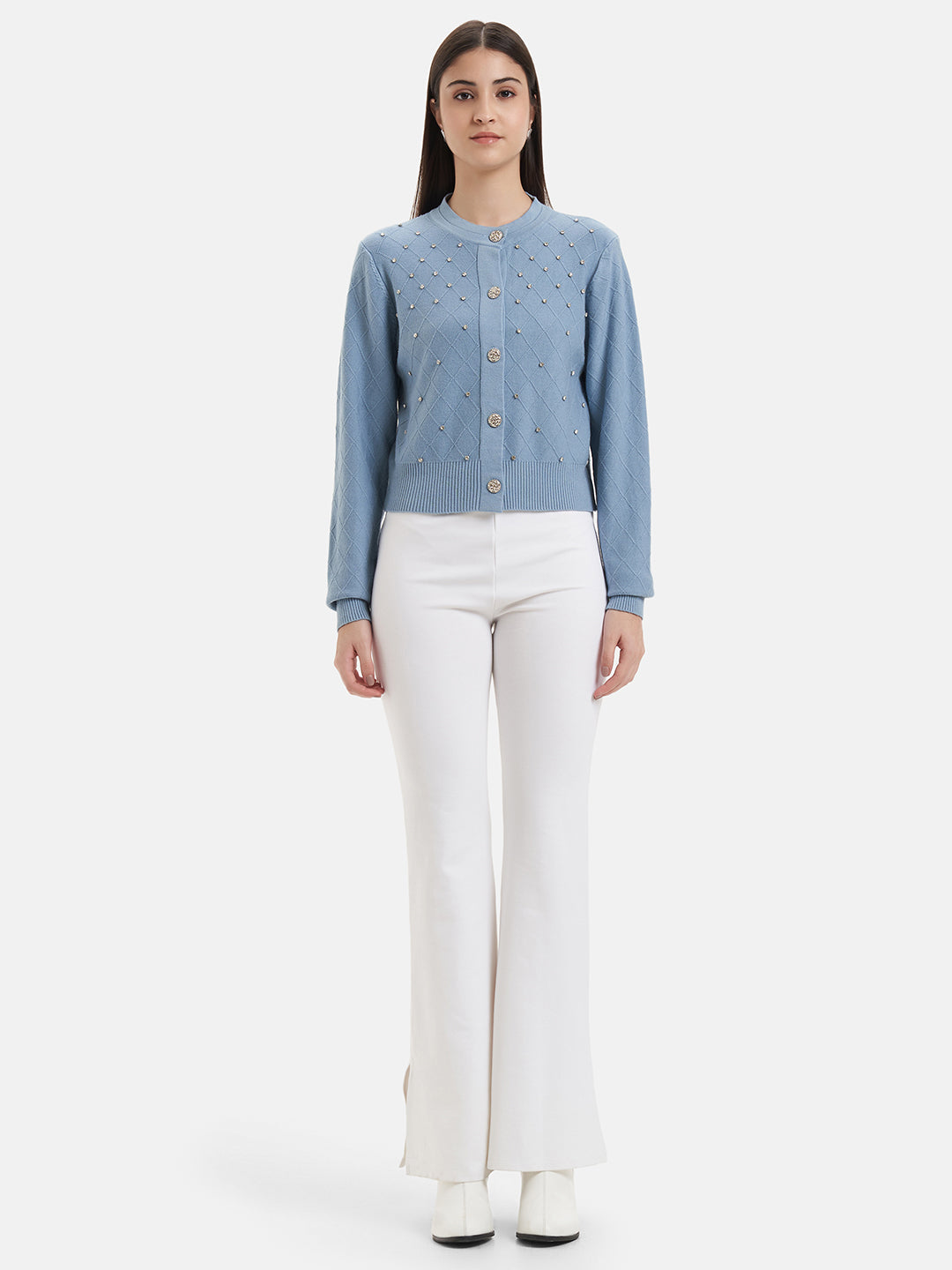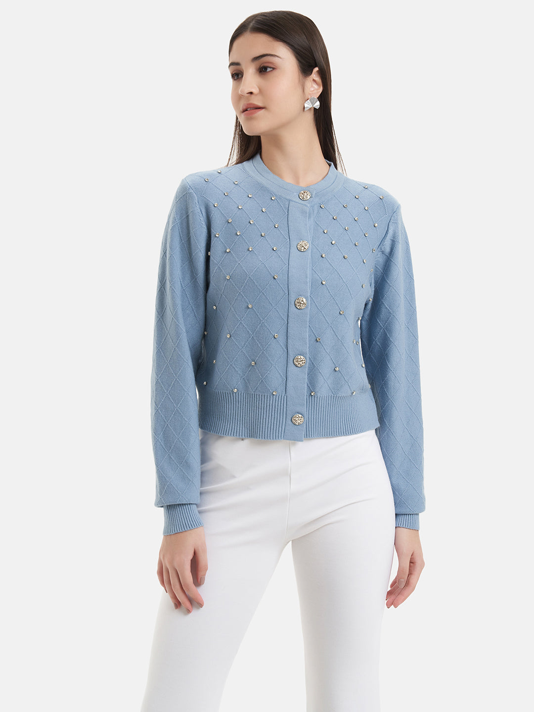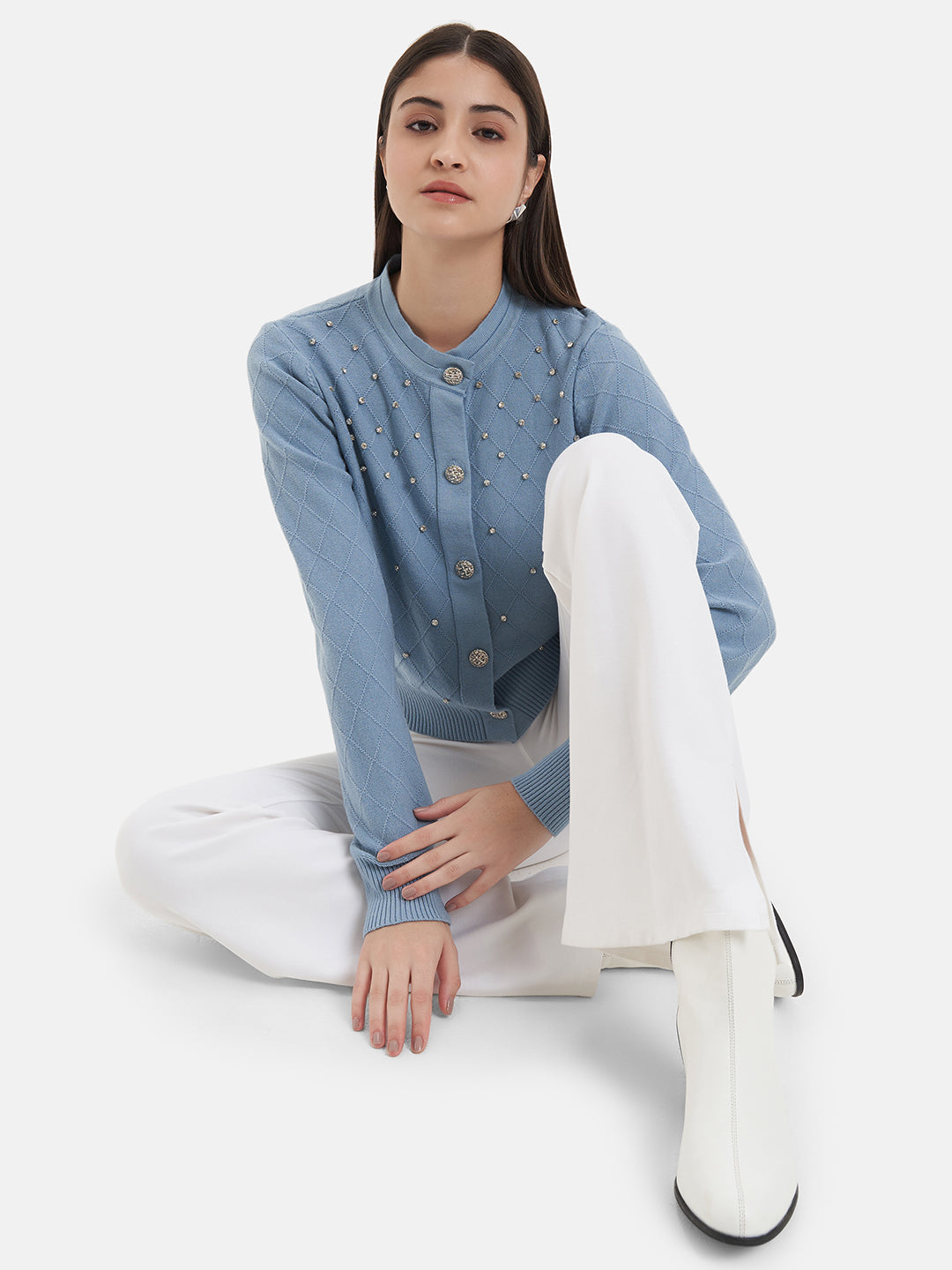 Hand Embellished Cable Knit Front Open Pullover. Pair It With White Pants And A Sling Bag Fo A Chic Look.