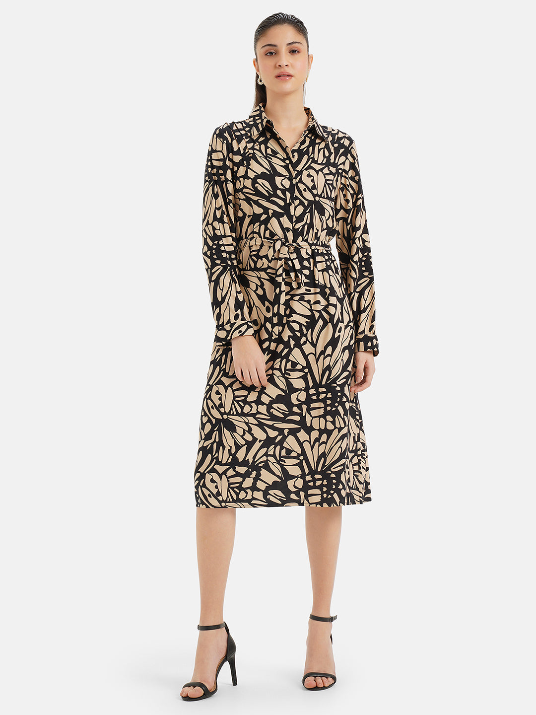 Butterfly Printed Shirt Dress Woth Pleat Detail. Pair It With Pointed Heels And A Handbag For A Trendy Work Look.